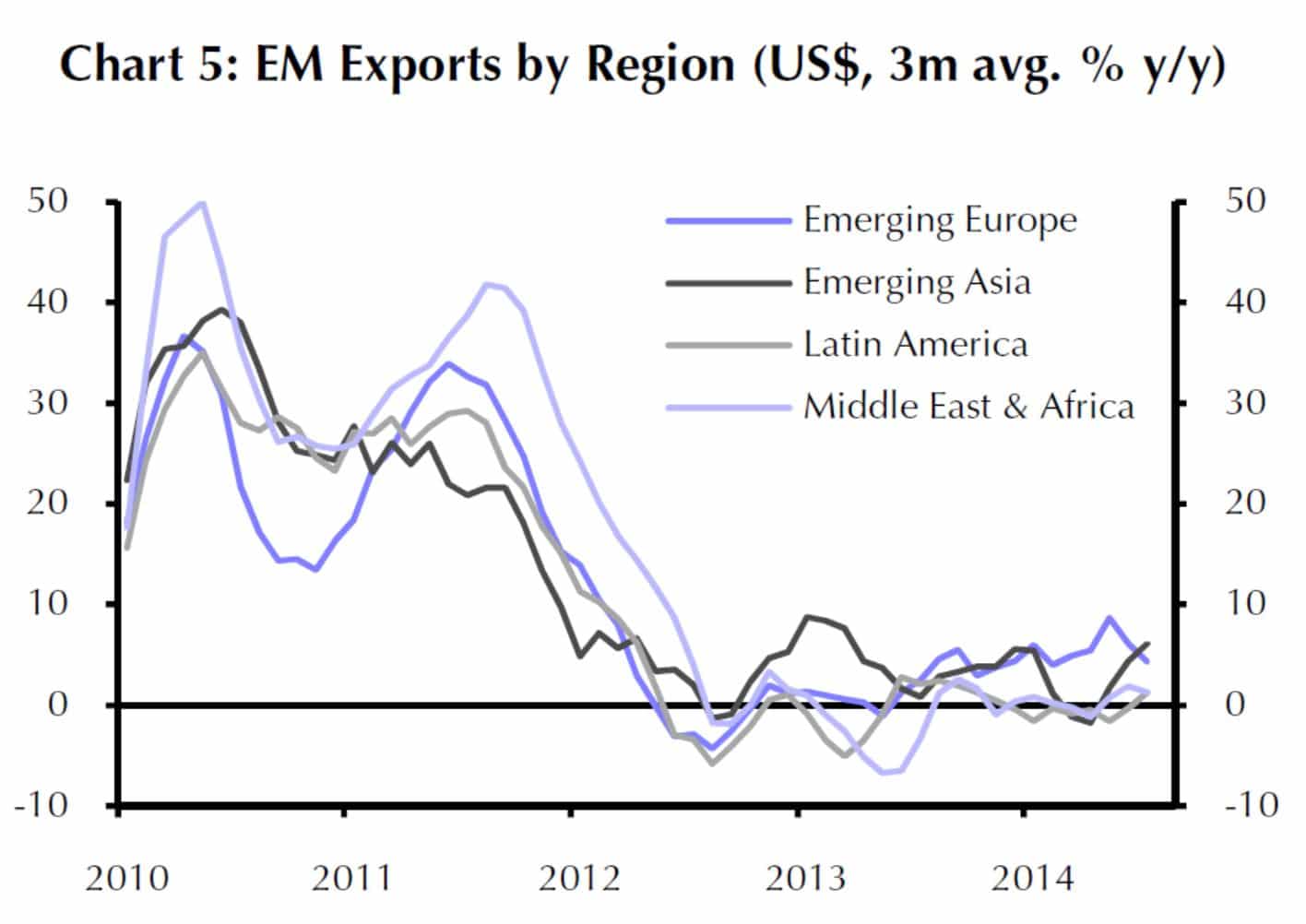 Die Exportleistung der Emerging Markets entwickelt sich je nach Region unterschiedlich: