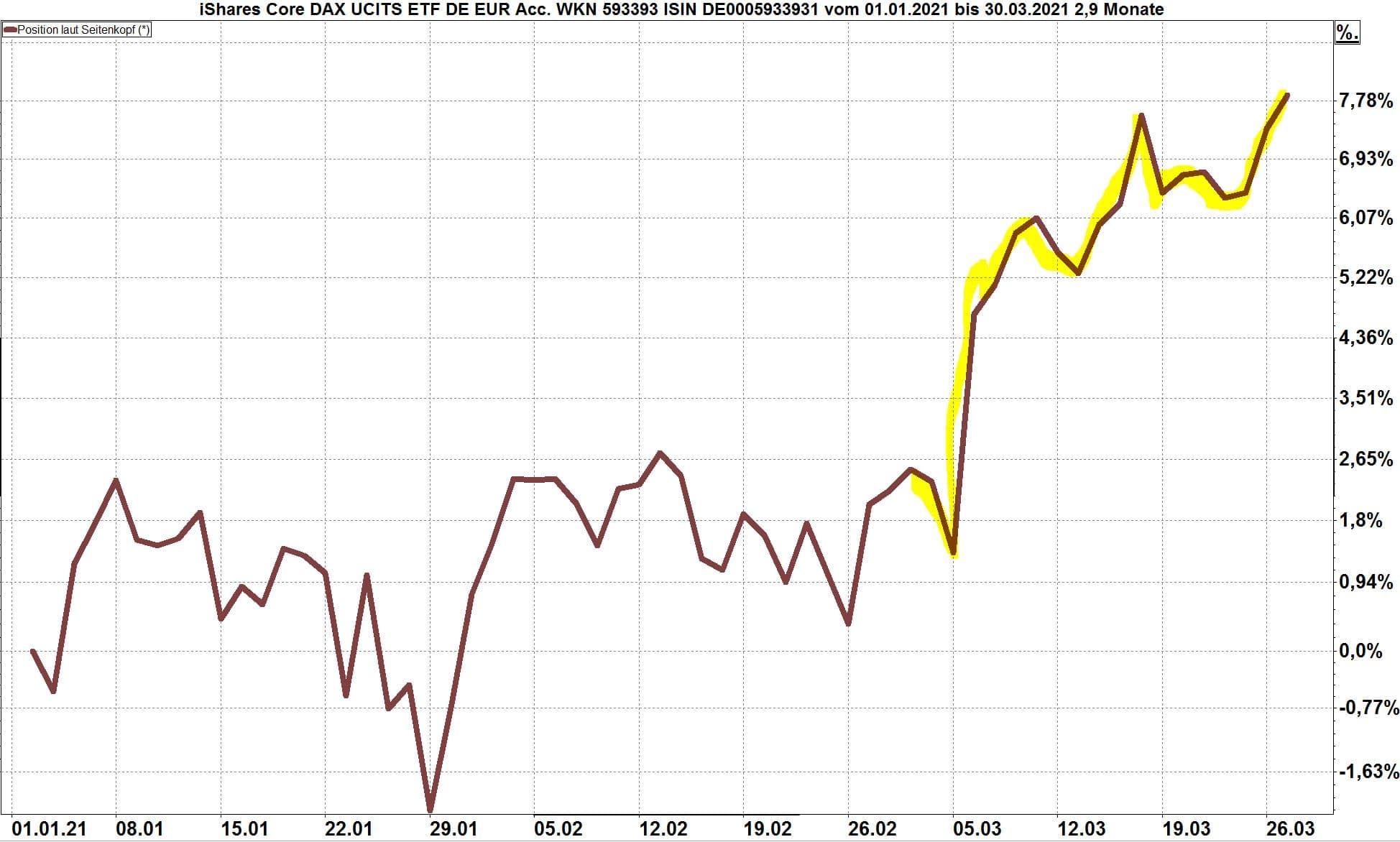 DAX vom 1.1. bis 26.03.2021 (März 2021 gelb hervorgehoben)
