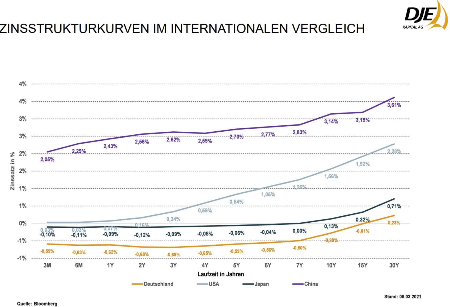 Die Zinsen werden nicht wesentlich steigen. Weder die Staaten noch die Unternehmen können sich höhere Zinsen leisten, schon gar nicht nach der gigantischen Erhöhung der Schulden während der Pandemie. Die Politik hat gelernt: Wir können die Notenbanken beeinflussen. Und die Politik wird es weiterhin tun. Die Zinsen werden auf niedrigem Niveau verharren, vermutlich nicht auf dem Extrem-Niveau von derzeit (Minuszinsen in Deutschland bis zu einer Laufzeit von 7 Jahren, Stand 8.3.2021), aber nicht deutlich höher.