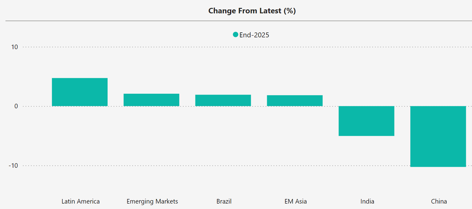 Schaubild: Prognose der Wertentwicklung einer Auswahl von Aktienmärkten bis Ende 2025.