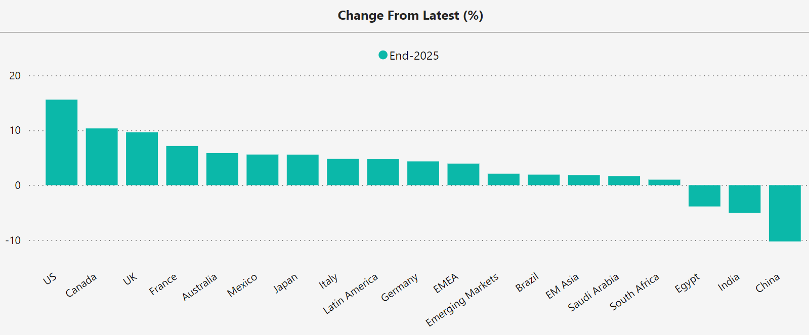 Die Prognosen für die Entwicklung der Aktienmärkte weisen tatsächlich auf erhebliche Unterschiede hin. Die Liste wird angeführt von den USA mit einem erwarteten Wertzuwachs von über 15 %. Für andere Regionen und Länder wird kein so gutes Ergebnis erwartet.