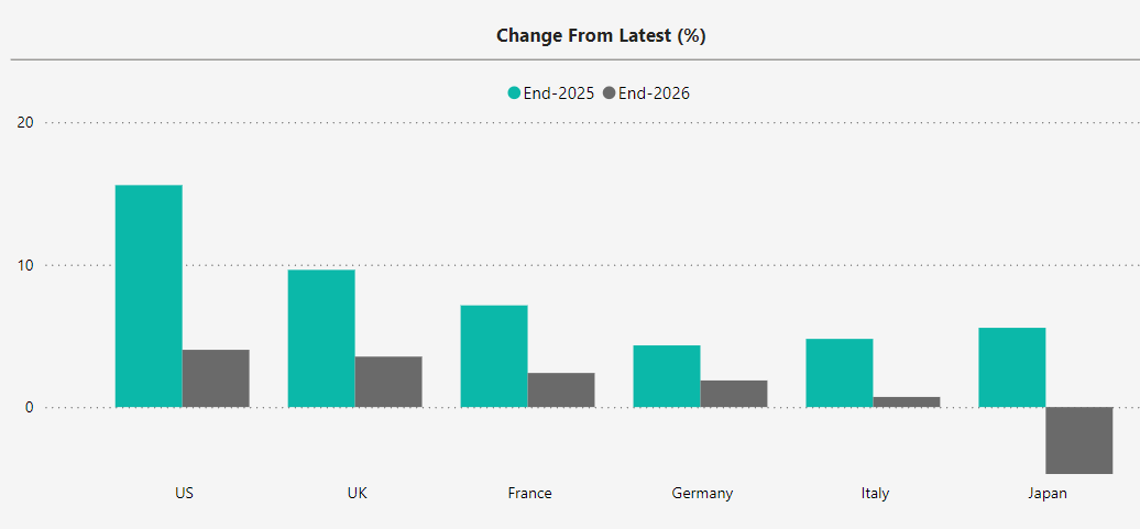Auch 2025 liegen die Prognosen für die USA höher als für die anderen Industrieländer. Das Schaubild zeigt die erwartete Wertentwicklung jeweils in lokaler Währung an.
