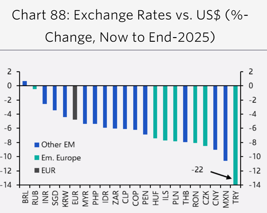 Die Inflationsraten werden in fast allen Ländern (Ausnahme: Litauen) leicht zurückgehen. Sie bleiben jedoch zu hoch, um deutliche Zinsenkungen zu rechtfertigen. In der Türkei bleibt die Inflation mit 25 % weiterhin sehr hoch (nach über 47 % in 2024). Dies muss auch berücksichtigt werden, wenn wir Angaben über die Aktienmärkte der Türkei in Landeswährung lesen.
