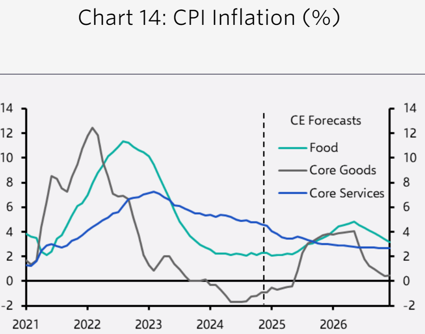 Zu erwarten ist, dass die Trump-Regierung Zölle einsetzen wird, um vermeintliche wirtschaftliche Gegner der USA zu bestrafen und Druck auf deren Verbündete auszuüben. Außerdem scheint es, dass Trump die Zölle zur Erhöhung der Staatseinnahmen erheben will, um damit Steuersenkungen zumindest teilweise zu kompensieren. Die Inflation in den USA wird als Folge der Trump’schen Zollpolitik später in Jahr 2025 ansteigen die 3-%-Grenze wieder überschreiten. Erst in 2026 wird die Inflationsrate wieder zurückgehen.