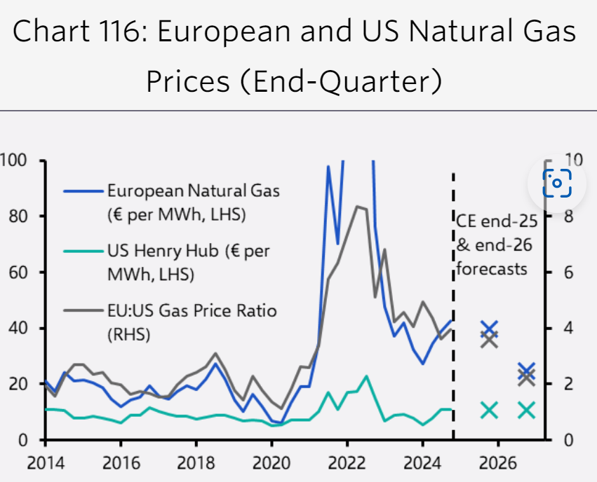 Der Preis für LNG in den USA wird nur geringfügige Veränderungen erleben. Der Preis für den Bezug von LNG in Europa, der im Jahr 2022 explosionsartig angestiegen war, wird sich 2025 und auch 2026 weiter reduzieren, jedoch immer noch über dem Preisniveau in den USA verbleiben.