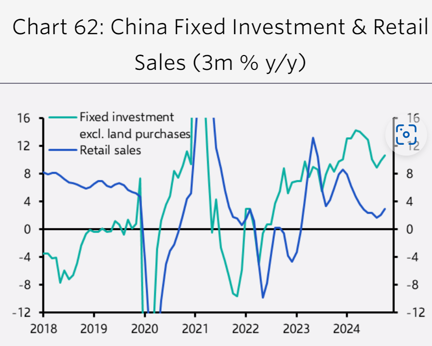 Schaubild: Die Einzelhandelsumsätze in China bewegen sich nicht in die von der Regierung gewünschte Richtung. Sie gingen auch in 2024 zurück (blaue Linie)