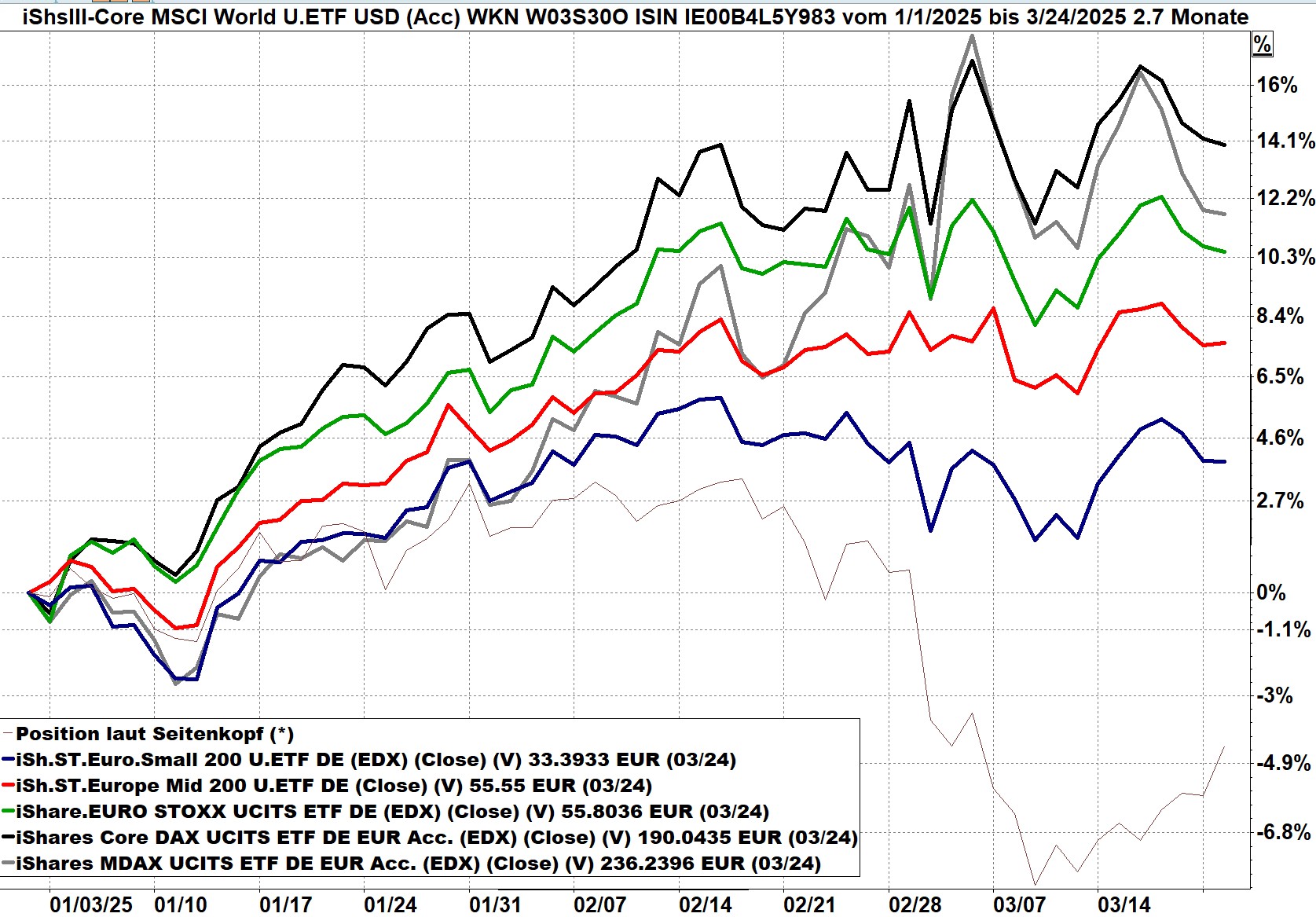 Die europäischen Aktienbörsen legten seit Jahresbeginn 2025 zu. Allerdings scheint es, dass sich die erste Euphorie schon abgekühlt hat. Seit Anfang März pendeln die Kurse volatil seitwärts. Die Investoren scheinen in Abwartehaltung zu verharren: Werden die angekündigten Investitionen tatsächlich umgesetzt? Werden die jedermann bekannten Hindernisse (z.B. Hemmnisse durch zu viel Bürokratie und Regulierung) tatsächlich abgebaut? Wenn ja, dann kann sich in Europa, allen voran in Deutschland, die positive Börsenentwicklung fortsetzen.