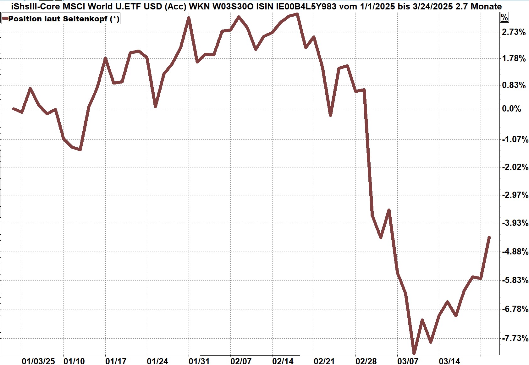 Die Grafik zeigt den iShares ETF auf den Weltaktienindex inklusive Dividenden vom 1. 1. bis zum 24. 3. 2025, dargestellt in Euro. Dieses Börsenbarometer mit über 1.500 Positionen aus 23 Industrieländern ging vom 19. Februar bis zum 11. März um etwas mehr als 11 % zurück. Wie so häufig nach einer so schnellen Bewegung folgte darauf eine „technische Reaktion“, die den Index aus seiner über-verkauften tiefen Bewertung wieder nach oben führte. Am 24. März stand der Weltindex, der mit etwa 70 % die Bewertung von US-Titeln widerspiegelt, noch etwa 4 % tiefer als zu Jahresbeginn.