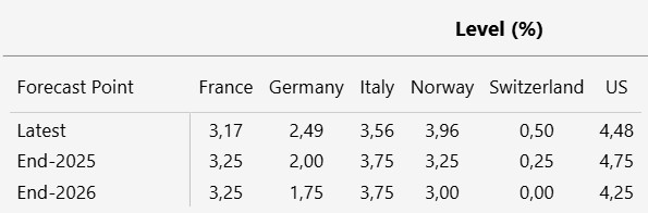 Für die EU wird allerdings unverändert eine schrittweise Reduzierung der Leitzinsen durch die EZB erwartet, bis zu einem Endstand unter 2 % im Jahr 2026.
