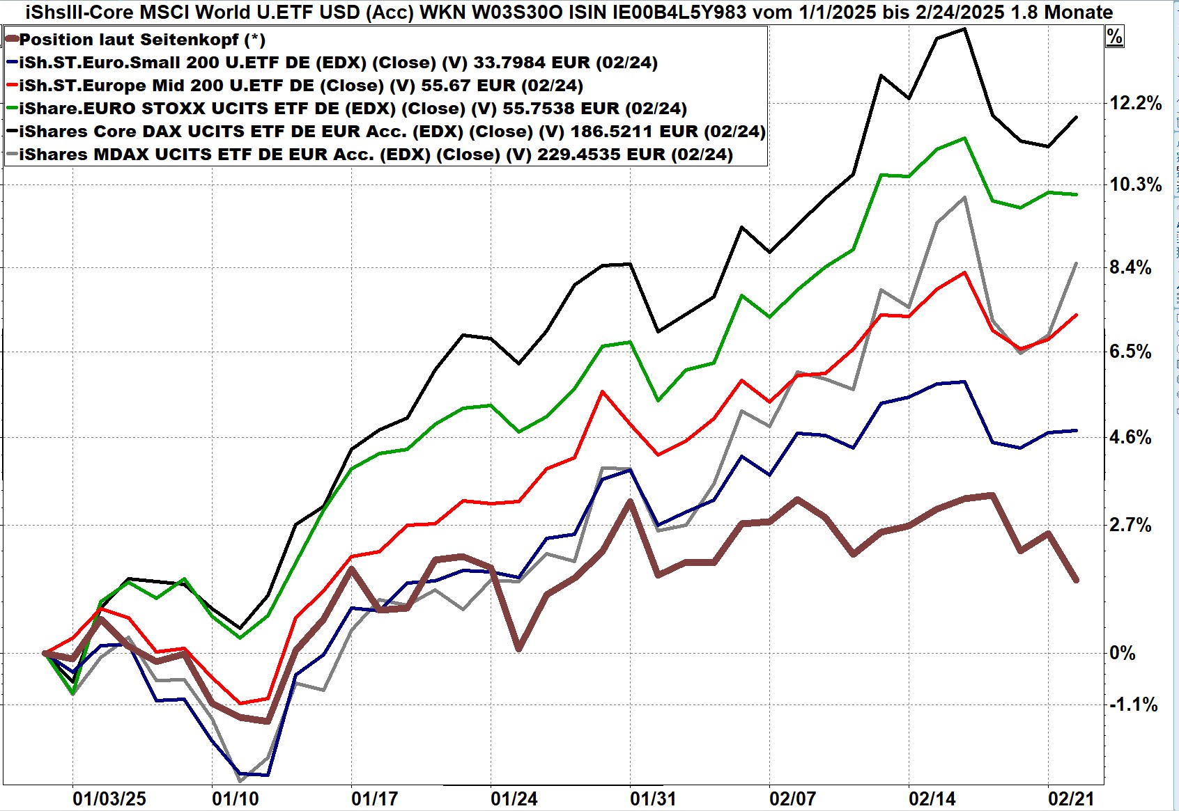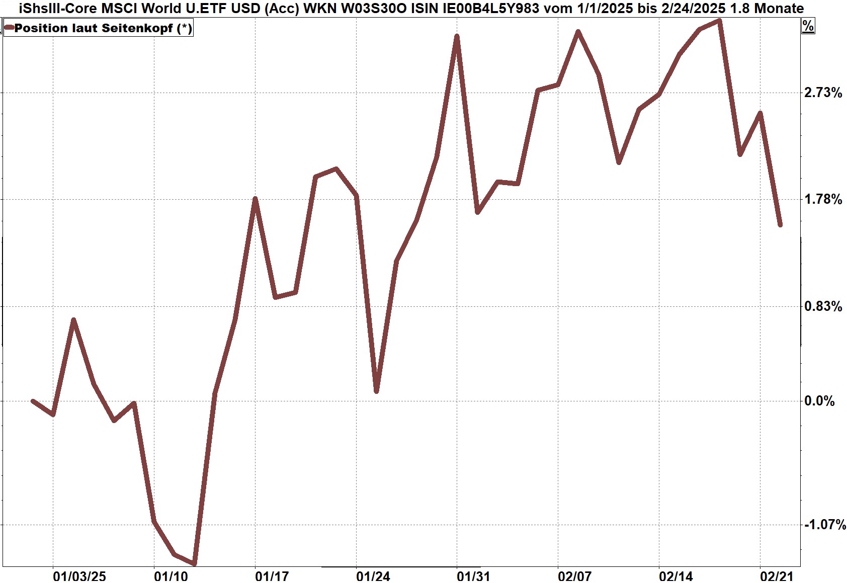 Die Grafik zeigt den iShares ETF auf den Weltaktienindex inklusive Dividenden vom 1. 1. bis zum 24. Februar 2025, dargestellt in Euro. Mit plus 1,6% bis zum 24.02 steht der Index genau auf dem gleichen Wert wie am 29.1. Im Monat Februar erzielte der Weltaktienindex somit keinen Wertzuwachs.