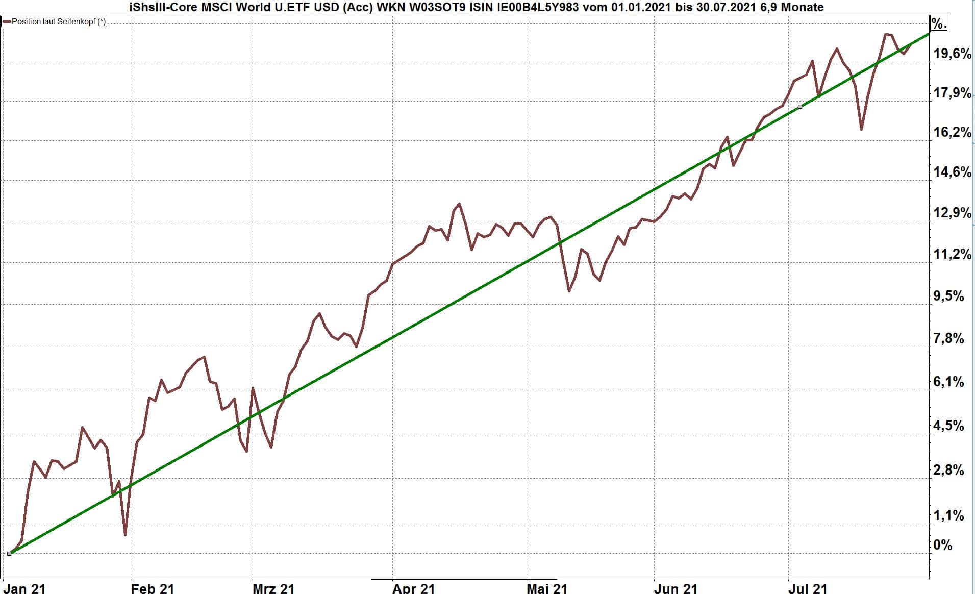Die folgende Grafik zeigt die Entwicklung des Weltaktienindex von Jahresbeginn bis zum 29.7.2021. Die grüne Linie zeigt die Wertentwicklung an. Mehr als 20 % in nicht ganz sieben Monaten! Ist das eine sinnvolle Ausgangsbasis für die künftigen Erwartungen?