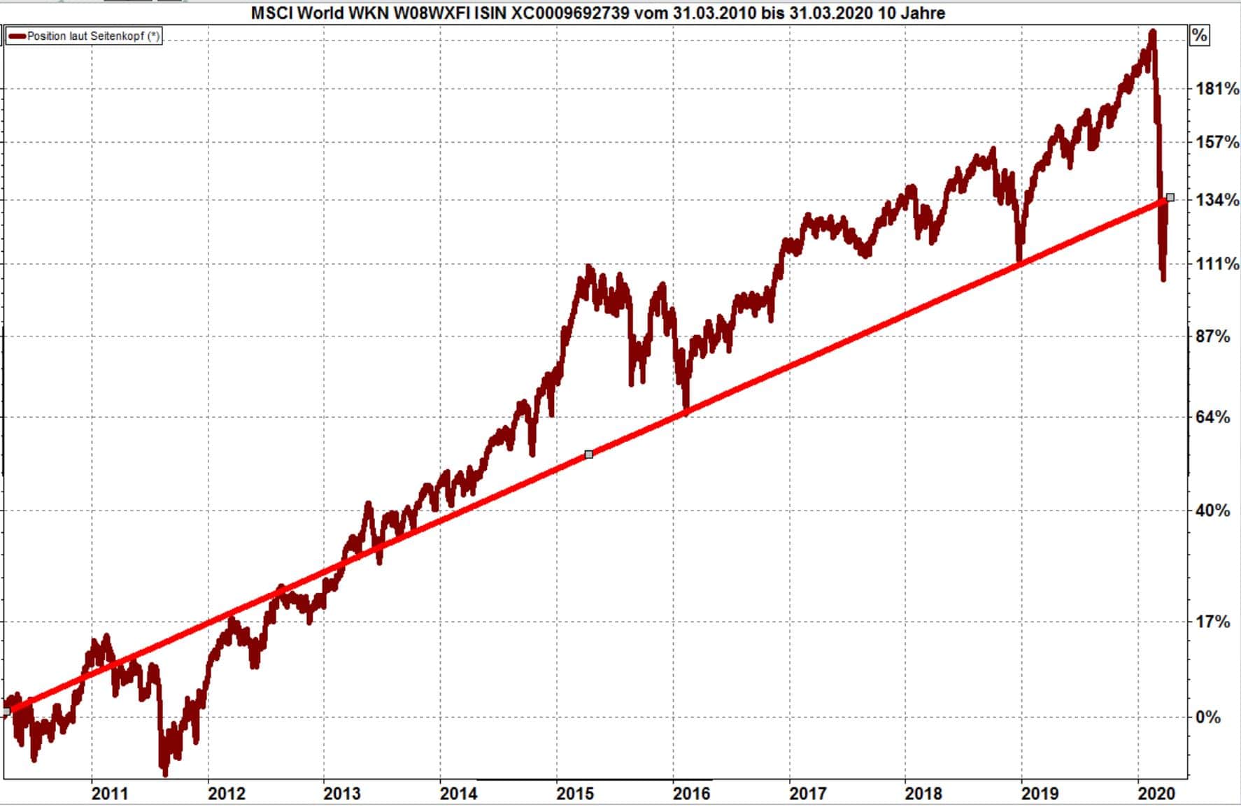 Die rote Linie zeigt die Wertentwicklung des MSCI World (inklusive Dividenden, nach Quellensteuern) für die letzten zehn Jahre an, unter Berücksichtigung des jüngsten Rückgangs. Der gesamte Wertzuwachs liegt bei 134 %. Der durchschnittliche Wertzuwachs beträgt 8,67 %.