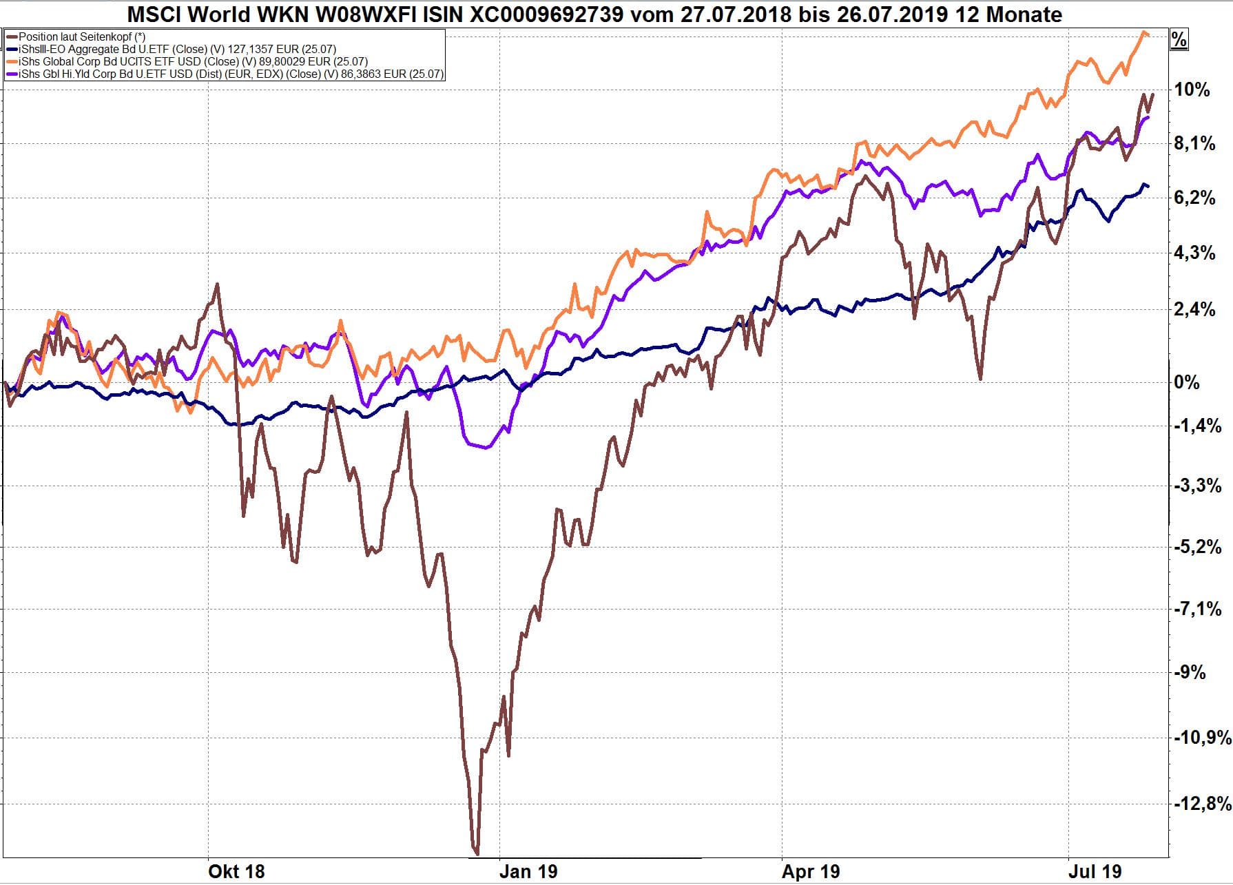 - Braune Linie: Weltaktienindex, in Euro bewertet, zum Vergleich
