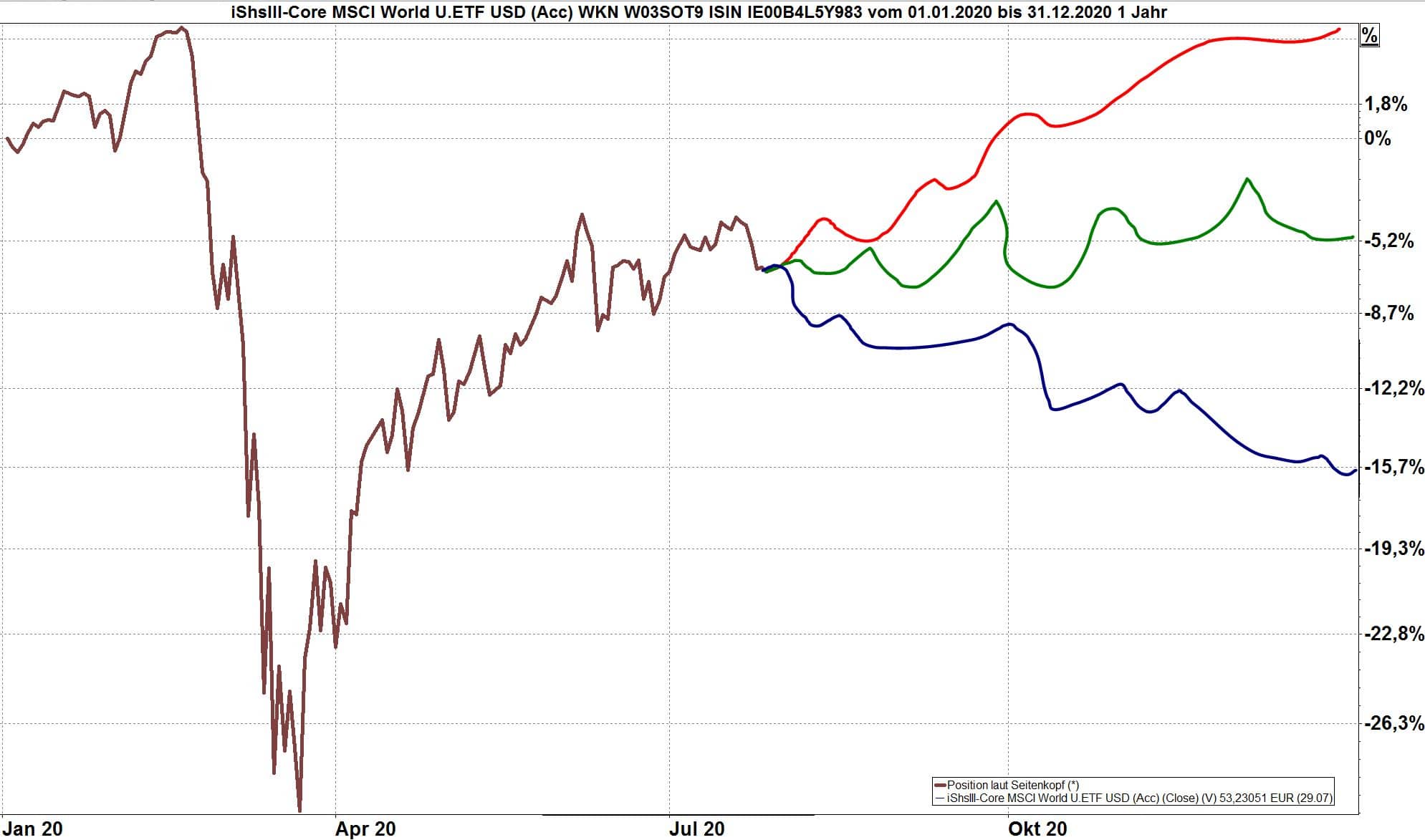 Per Ende Juli fehlten bis zum Stand zu Jahresbeginn nur noch etwa fünf Prozent. Die folgende Grafik zeigt mit der braunen Linie die Entwicklung eines ETF auf den Weltaktienindex bis zum 29.07. und drei Denkmodelle für die weitere Entwicklung bis zum Jahresende.