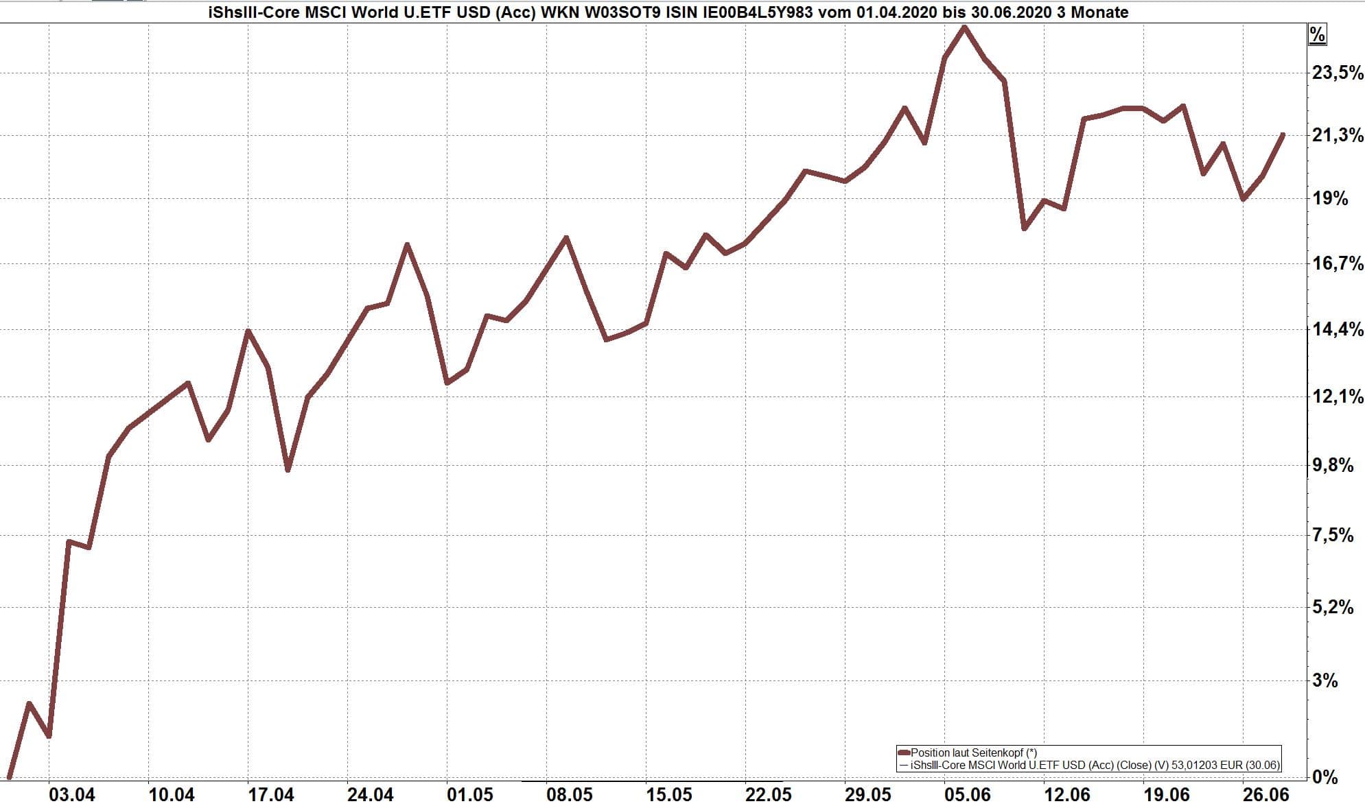Der Weltaktienindex legte im zweiten Quartal 2020 um mehr als 20 % zu, hier dargestellt über einen ETF von iShares auf den Weltindex.