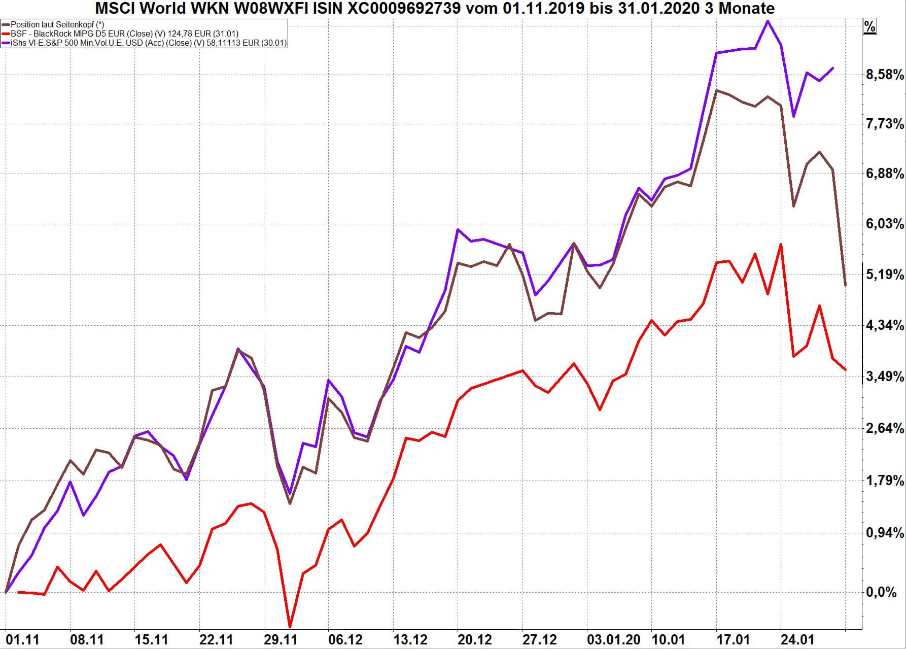 Deutlich erkennbar ist der stabilere („robustere“) Verlauf der Wertentwicklung der Position, die eine „Minimum Volatility“ – Entwicklung anstrebt. (lila) Mit 8,6 % hat diese Position seit 1.11.2019 den größten Teil der positiven Entwicklung mitgenommen, ist in der Angstphase seit 17.1.2020 jedoch nicht so stark zurückgegangen.