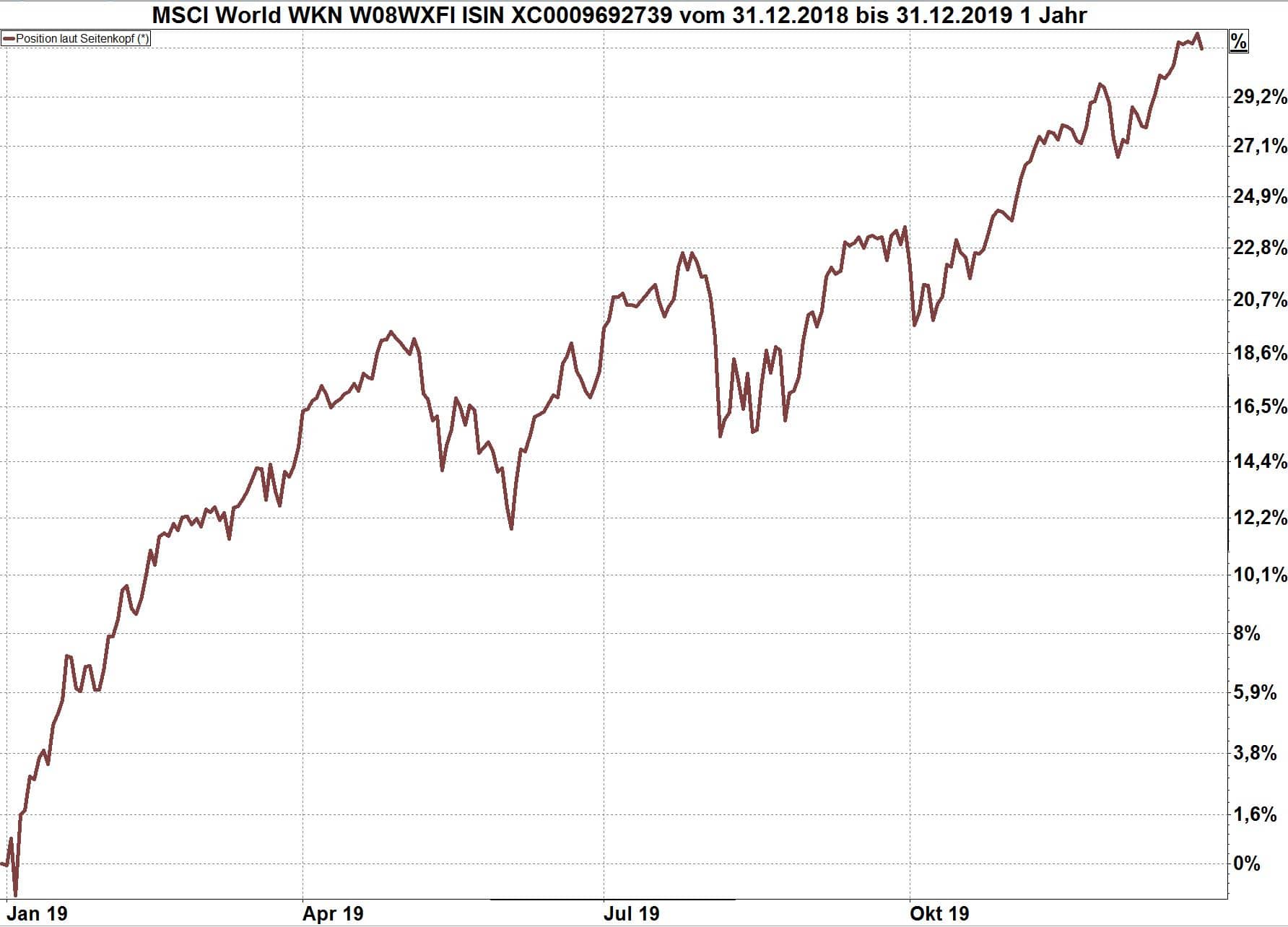 Mit Bezug auf das Aktienjahr 2019 werden zahlreiche Beiträge erscheinen, die 2019 als ein „hervorragendes Börsenjahr“ beschreiben. Das ist rein statistisch absolut richtig: vom 1.1. bis 31.12.2019 sind zahlreiche Börsen kräftig gestiegen, einige sogar deutlich über 30 %. Auch der Weltaktienindex legte (aus Sicht eines Euro-Anlegers) um über 30 % zu.