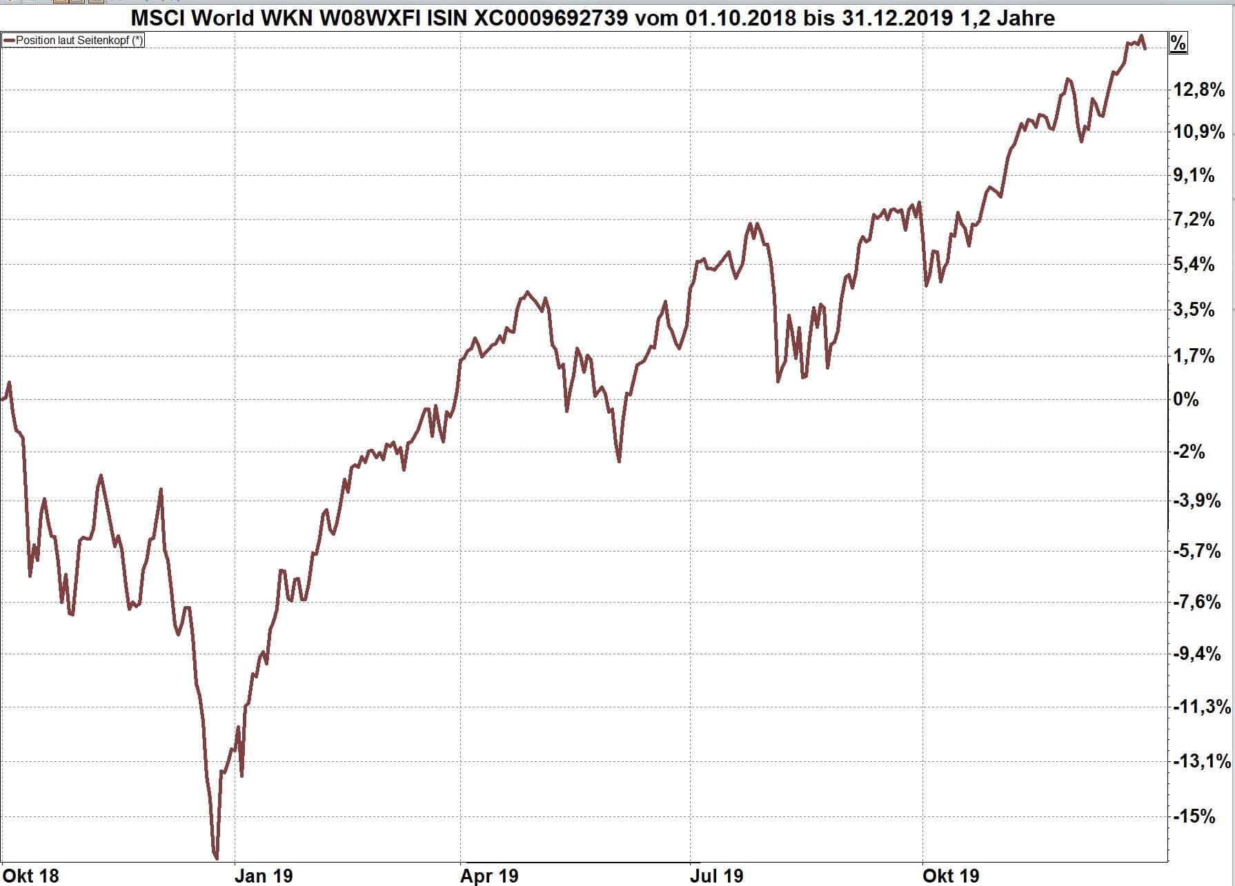 Das relativiert den Eindruck für das Börsenjahr 2019. Der Weltindex steht per Ende 2019 etwa 14 % über dem Stand vom 1. Oktober 2018. Das ist immer noch ein sehr gutes Ergebnis, aber eben kein Hype von 30 % oder mehr, was die Vermutung von einem alsbaldigen Rückgang schüren würde.