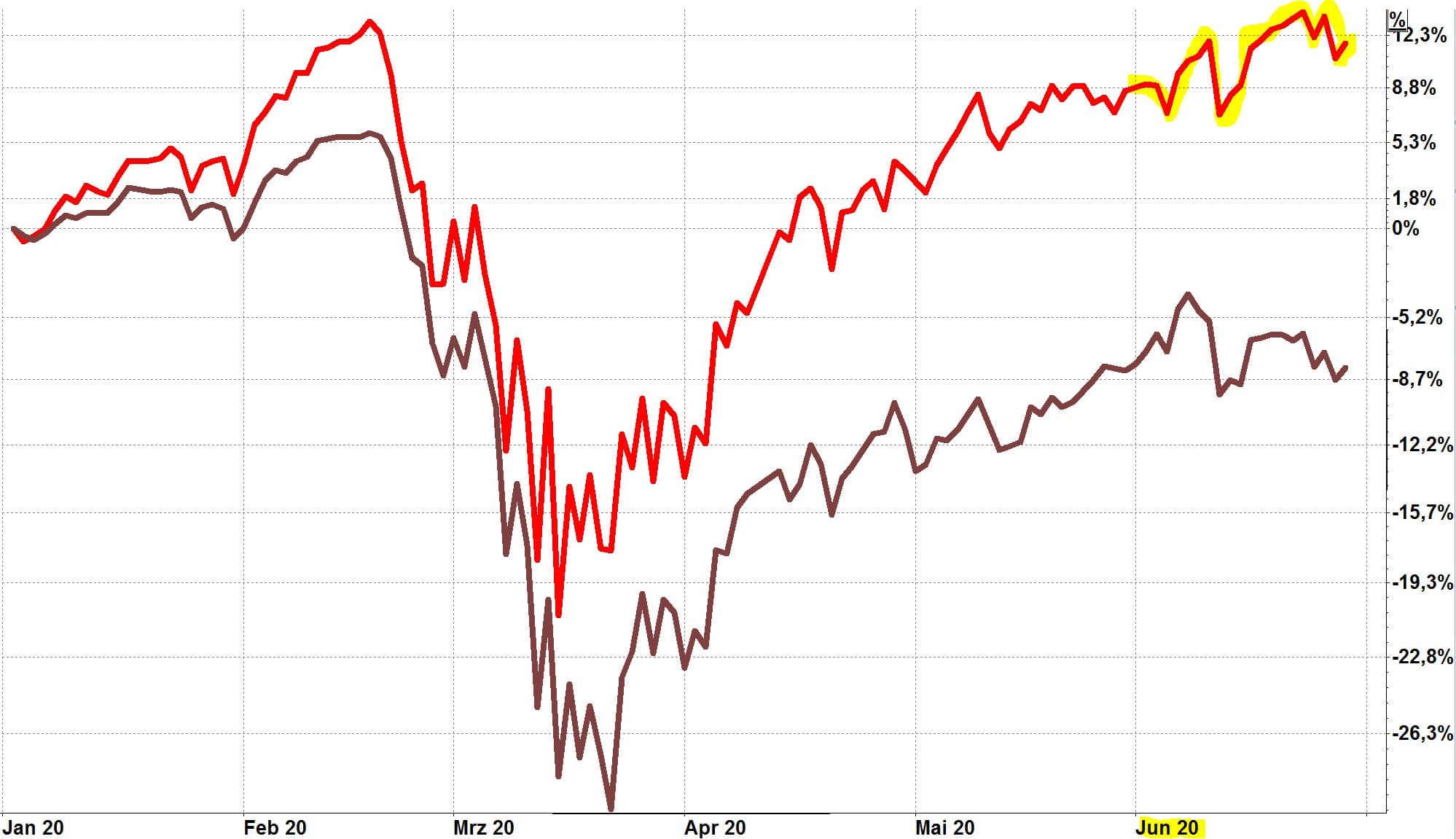 Chart: Weltindex (braun) und Nasdaq 100 (rot) im Juni 2020. Quelle: vwd.
