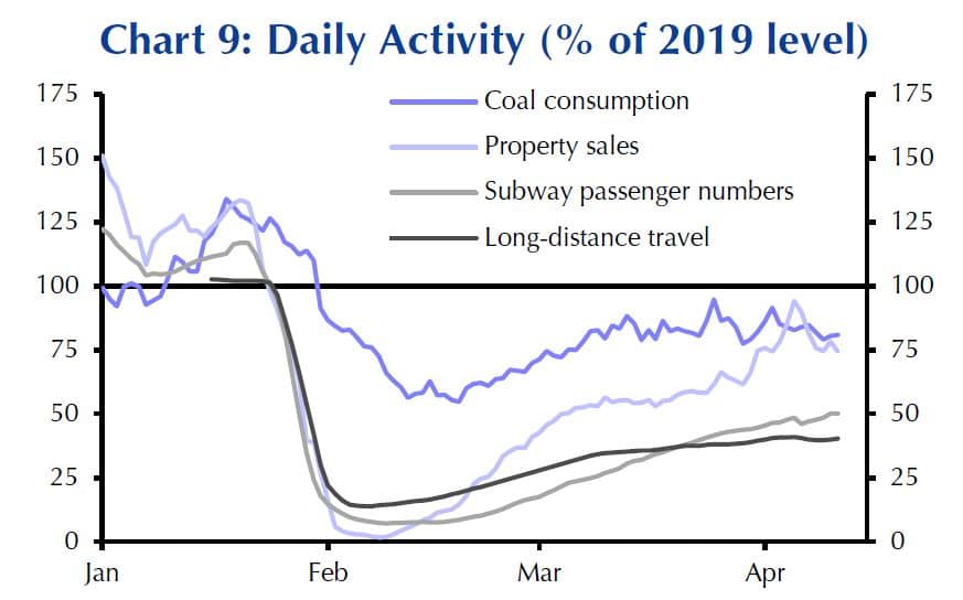 Die folgende Grafik zeigt am Beispiel von China, wie schnell alle Aktivitäten zunächst heruntergefahren wurden und wie diese Vollbremsung in kleinen Schritten langsam wieder gelöst wird.