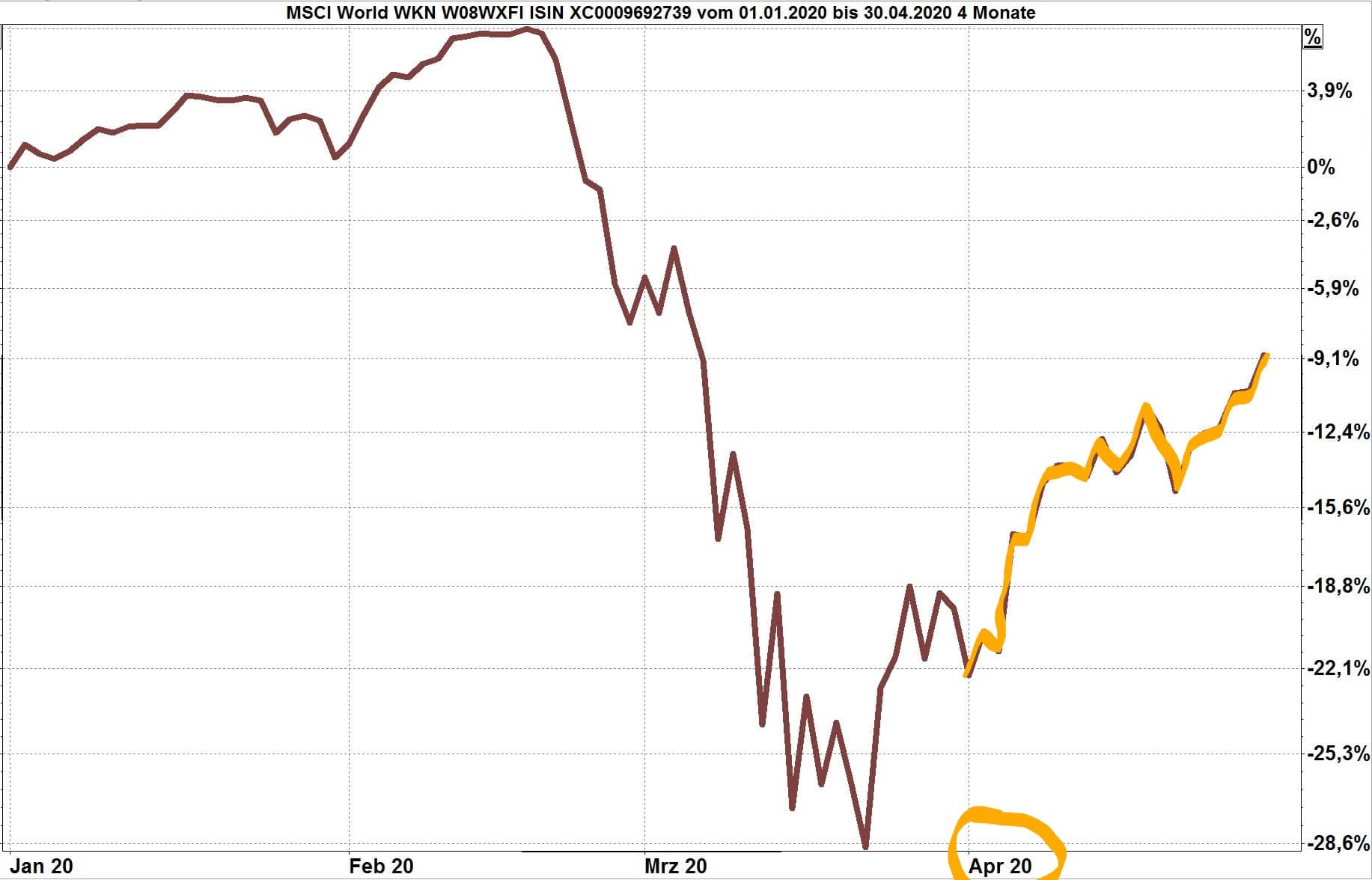 In der Vorschau für den Monat April 2020 schrieb ich: „Die Börsen nehmen erfahrungsgemäß die erwarteten Entwicklungen der Unternehmensgewinne um drei bis sechs Monate voraus. Eine Reduzierung der Gewinne, auch eine Anzahl Insolvenzen, erscheint nach dem starken Rückgang der Kurse weitgehend eingepreist.“