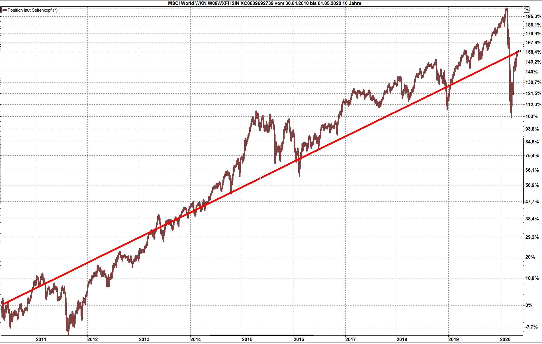 Anfang April zeigte ich diese Grafik. Es ist Wertentwicklung des MSCI World (inklusive Dividenden, nach Quellensteuern) für die letzten zehn Jahre an, bis zum 31.03.2020. Der durchschnittliche Wertzuwachs beträgt 8,67 %.