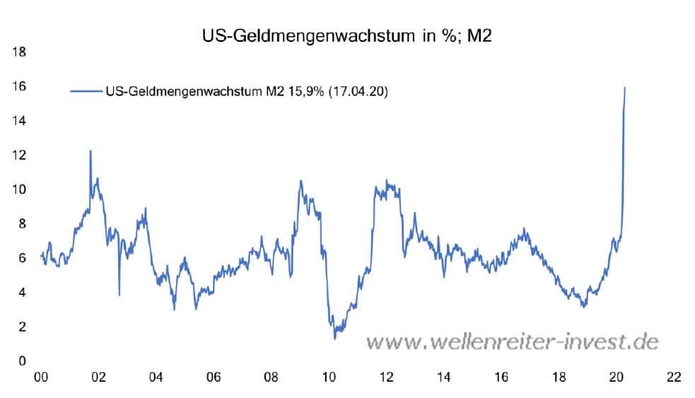 Die Maßnahmen der Notenbanken führen – hier am Beispiel USA – zu einer extrem schnellen Ausweitung der Geldmenge. Sehr viel Geld in den Finanzmärkten führt stets zu einer hohen Kaufbereitschaft der Investoren und damit zu steigenden Aktienkursen.