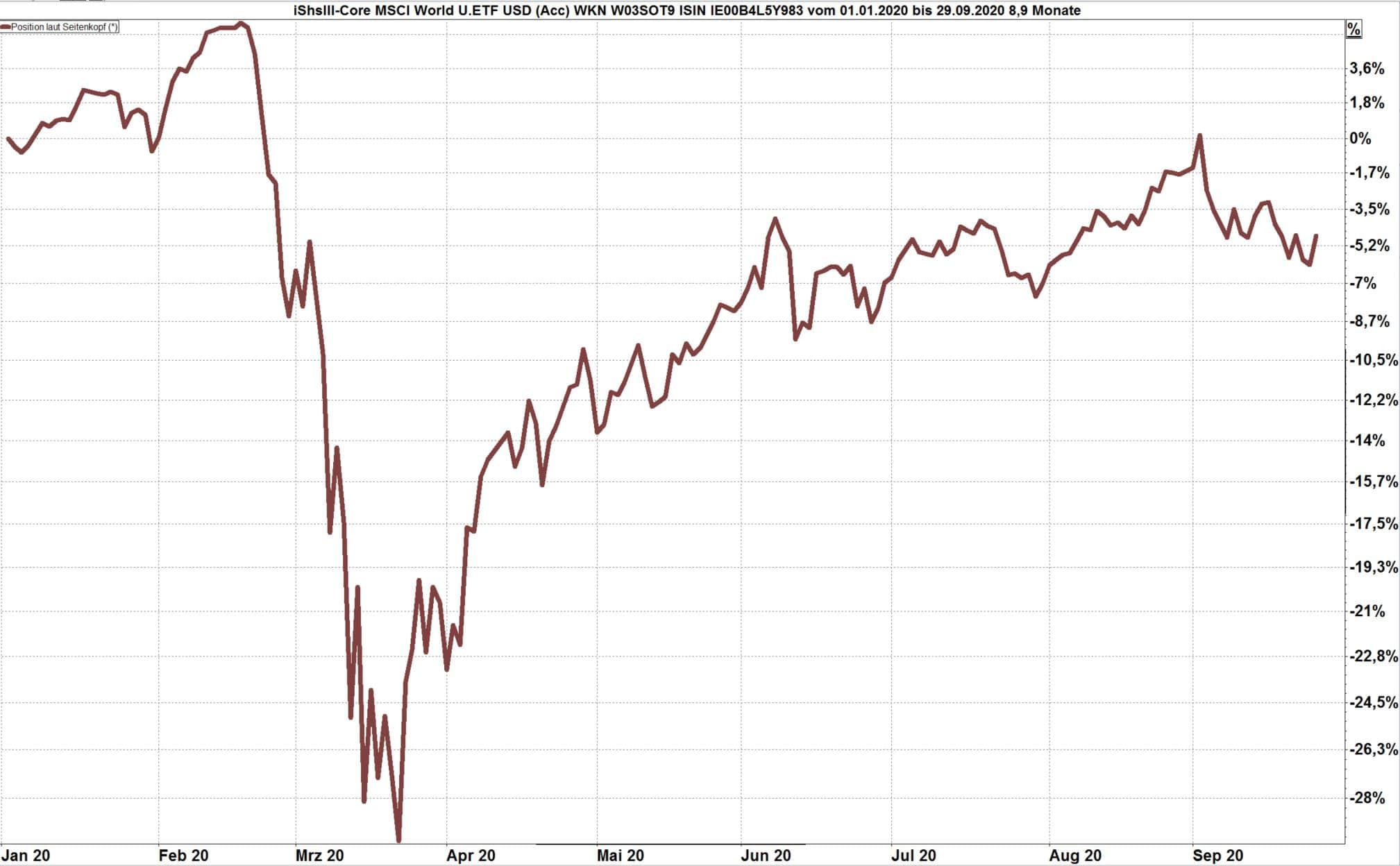 Chart: Entwicklung des Weltaktienindex vom 1.1.bis 29.9.2020, Darstellung in Euro.
