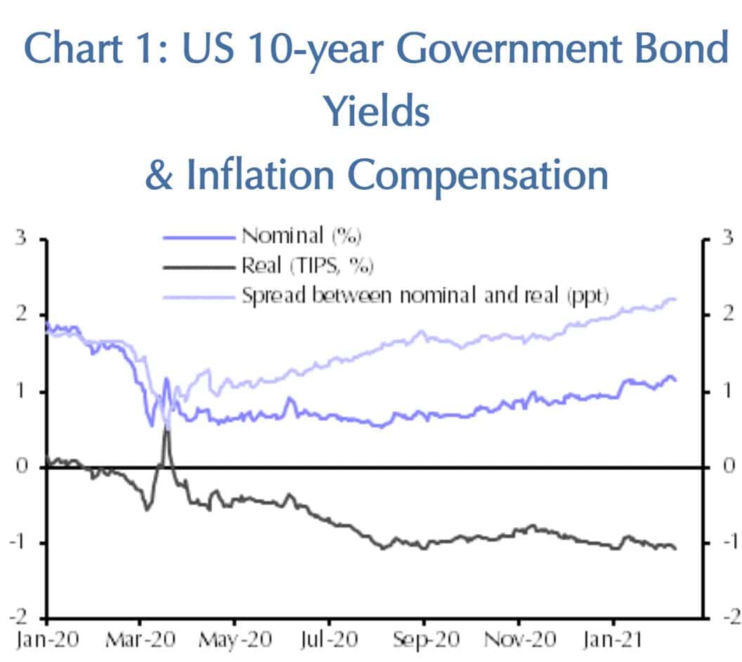 Die folgende Grafik zeigt die Entwicklung des Zinsniveaus für 10jährige Anleihen der USA im Vergleich zur Inflationsrate von Januar 2020 bis Februar 2021. Die Nominalzinsen (dunkelblaue Linie) sind tatsächlich ganz leicht gestiegen bis auf ca. 1,1 % am rechten Ende der Grafik. (Bis Ende Februar 2021 erfolgte ein weiterer Anstieg bis etwa 1,5 %). Die hellblaue Linie zeigt den Unterschied zwischen dem nominalen Zins und dem realen Zins nach Abzug der Inflationsrate. Dieser Unterschied liegt am rechten Rand der Grafik (ca. 15.2.) bei über 2 %. Das heißt: Anleger, die Mitte Februar Zehnjährige Staatsanleihen der USA kauften, verlieren real etwa 1 %, da die Inflationsrate höher ist als der nominale Zinsertrag dieser Anleihen. (siehe schwarze Linie in der Grafik)