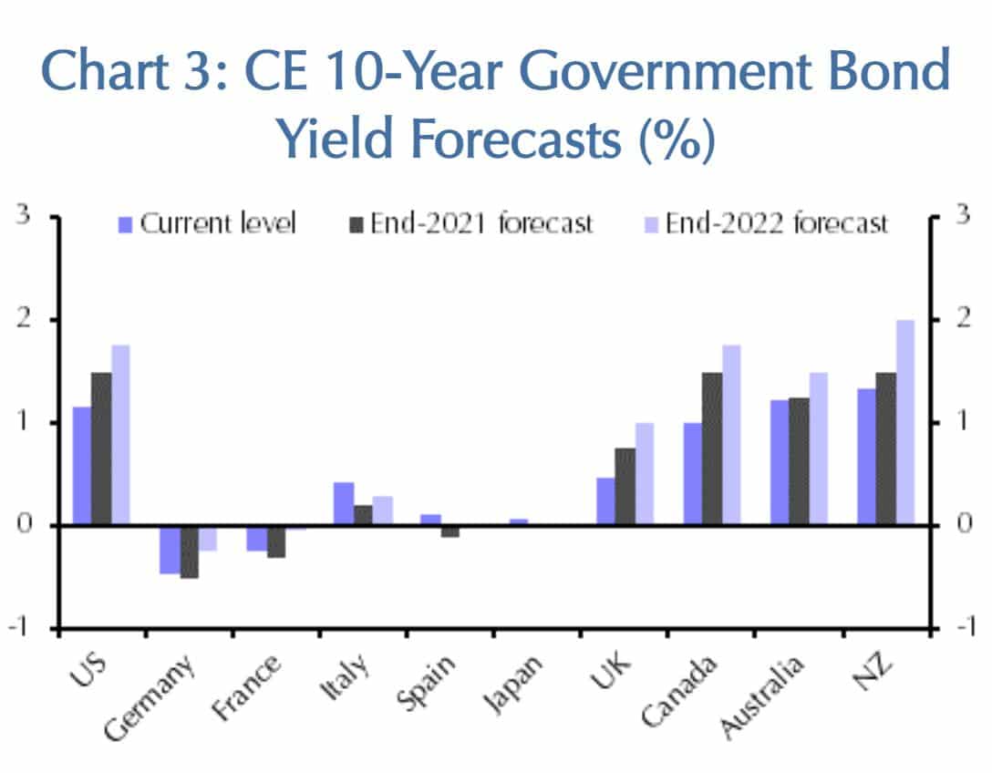 Die Vorschau auf die erwartete Zinsentwicklung für 10jährige Staatsanleihen zeigt, dass das Zinsniveau nicht nur in den USA auf einem niedrigen Stand bleibt, sondern auch in anderen Wirtschaftsregionen der Welt.