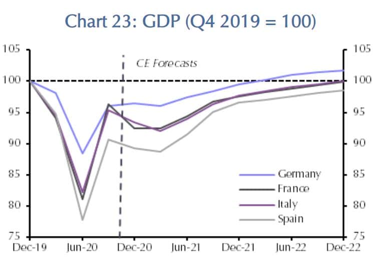 Deutschland wird – trotz Verzögerungen beim Impfprogramm – das Vorkrisenniveau der Wirtschaftsleistung schon 2021 erreichen. Frankreich und Italien bis Ende 2022, Spanien braucht etwas mehr Zeit.