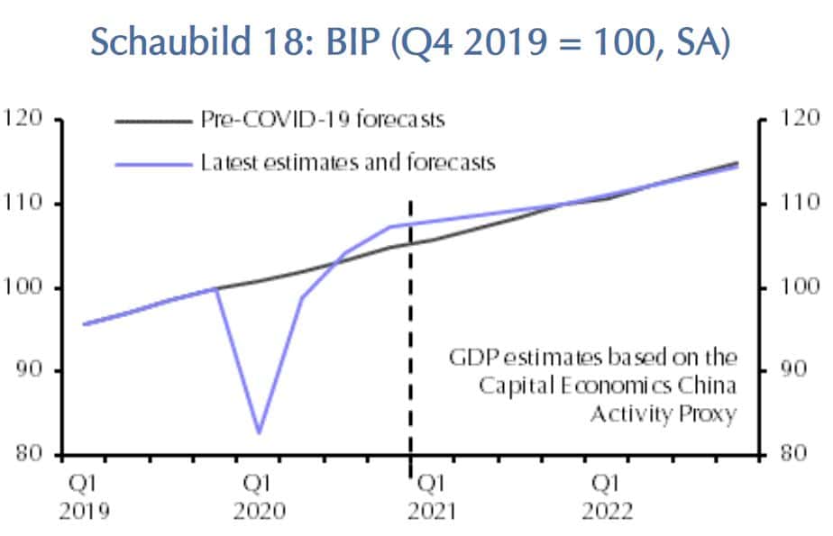 Chinas Wirtschaftsleistung ist auch in 2021 gestiegen. Damit sind China, Taiwan und Vietnam die einzigen Länder mit einem positiven Wirtschaftswachstum in 2020. In 2021 wird die Wirtschaftsleistung – je nach Autor der Prognosen – um 8 bis 10 % zulegen. Dies ist auch auf die Produktionsausfälle in anderen Ländern zurückzuführen, die zumindest vorübergehend durch Lieferungen aus China ersetzt werden. Für 2022 rechnet Capital Economics mit einem Einschwenken auf den Wachstumspfad gemäß den Erwartungen vor Ausbruch der Pandemie.