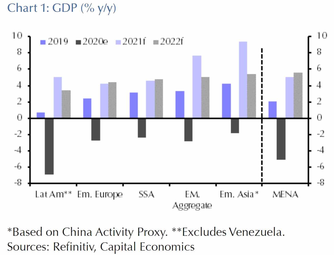 In der Gruppe der Schwllenländer führt Asien das Wirtschaftswachstum an. Der Rückgang in 2020 war geringer als in den anderen Regionen. Die Erholung 2021 und auch 2022 ist stärker als in Lateinamerika, den aufstrebenden Staaten in Europa und der Subsahara-Region. Nur der Mittlere Osten und Nordafrika könnten – dann aber erst 2022 – ähnlich stark zulegen wie Asien.