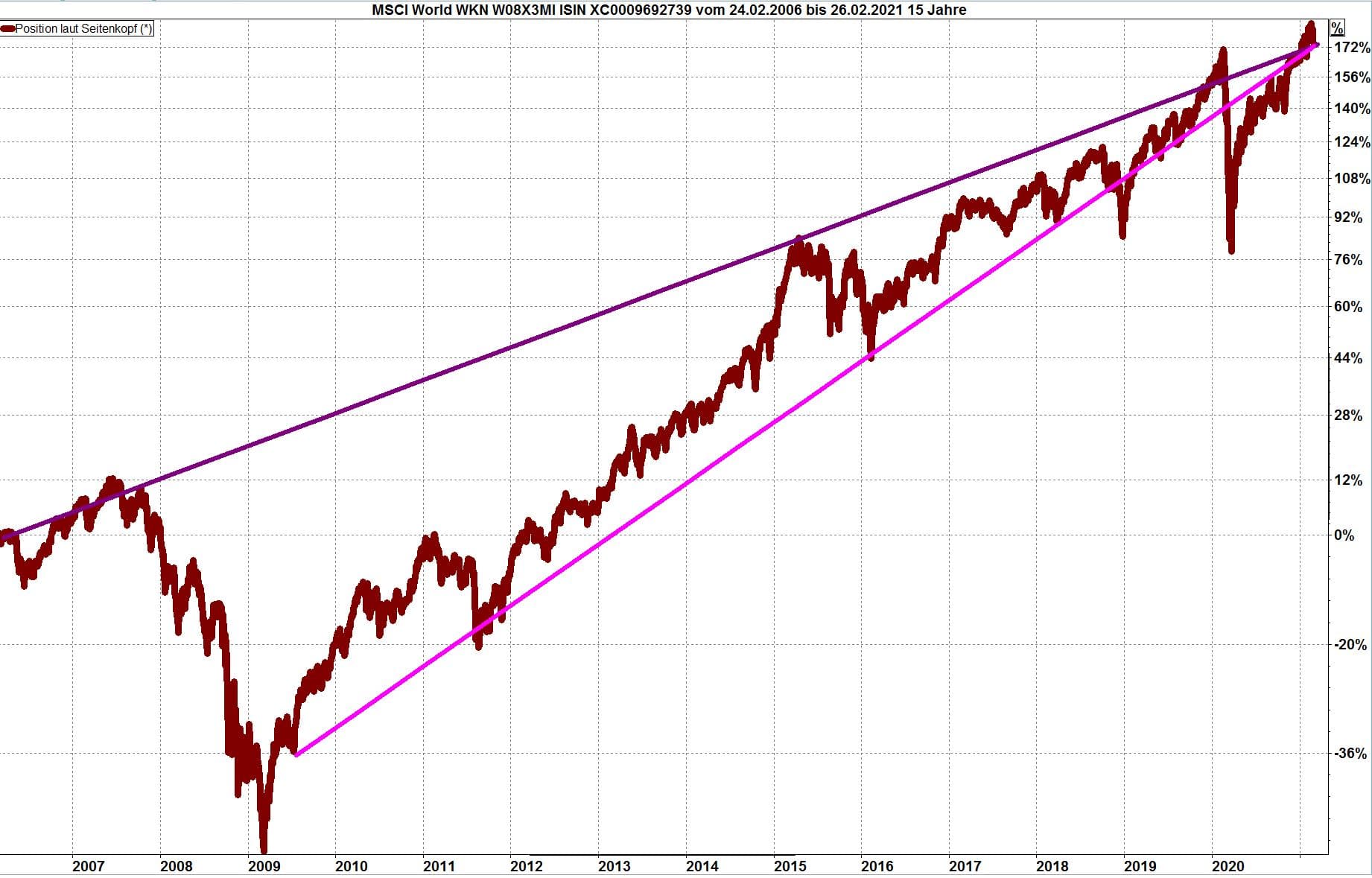 Die folgende Grafik zeigt den Weltaktienindex in den letzten 15 Jahren. Die dunkel-lila Linie zeigt einen Wertzuwachs von 6,9 % (inklusive Dividenden, nach Abzug der Quellensteuern) an. Die hell-lila Linie zeigt einen Wertzuwachs von 13 % an. Irgendwo dazwischen wird wohl die persönliche Realität für jeden Anleger liegen, je nachdem, wann er sein Investment begonnen hat.