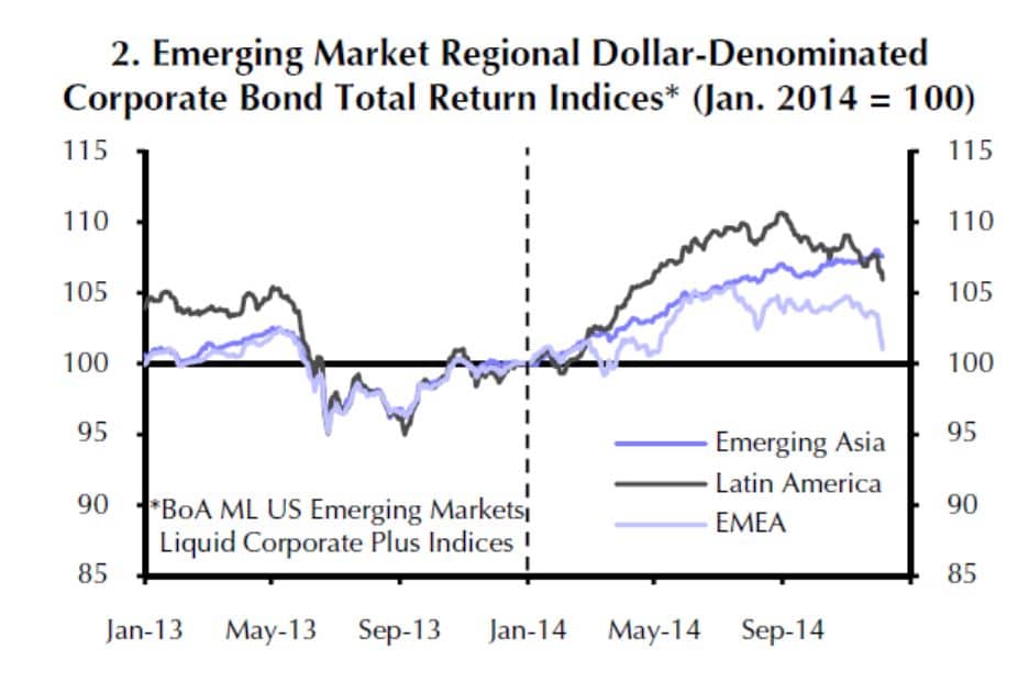 Seit Ende Oktober erzielten die in USD ausgegebenen Anleihen der Emerging Markets Unternehmen einen deutlich schlechteren Wertzuwachs als die mit vergleichbarem Rating versehenen USD-Unternehmensanleihen. Der wesentliche Grund hierfür waren wachsende Risikoaufschläge. Bei den Investoren wuchs die Besorgnis, dass die stark gestiegene Verschuldung der Unternehmen in den Emerging Markets diese anfälliger gegen einen starken USD werden lassen.