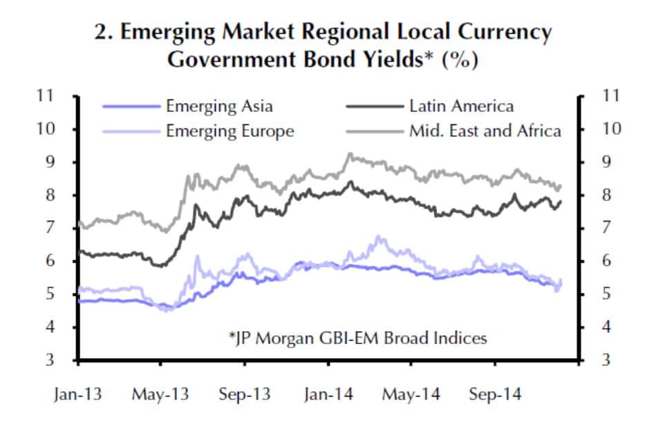 Die Anleihen in lokalen Währungen (das sind stets Regierungsanleihen der entsprechenden Länder) bieten im Mittleren Osten und Afrika bis über acht Prozent Zinserträge (siehe hellgraue Linie). Auch Lateinamerika (schwarze Linie) lockt mit fast acht Prozent Zinsertrag, wogegen die Staatsanleihen der asiatischen Länder (dunkelblau) bei nur mit etwa fünf Prozent verzinst werden.