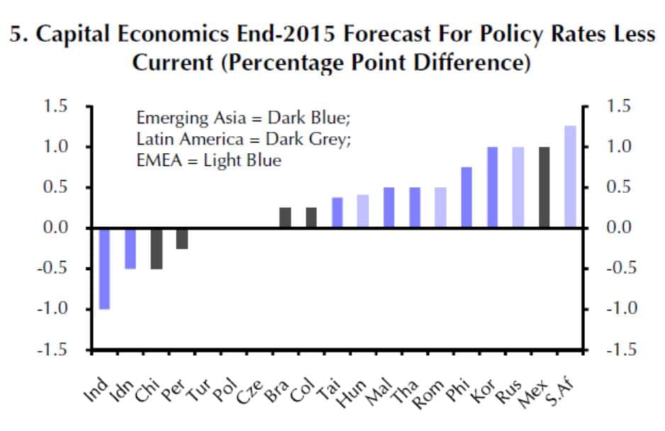 In Südafrika, Mexiko, Russland, Korea und einigen weiteren Ländern (siehe Grafik, von rechts nach links) werden die Leitzinsen bis Ende 2015 vermutlich angehoben und damit die Geldpolitik verschärft. Andere Länder wie Indien, Indonesien, Chile und Peru können aufgrund der gesunkenen Inflationsrate die Leitzinsen senken.