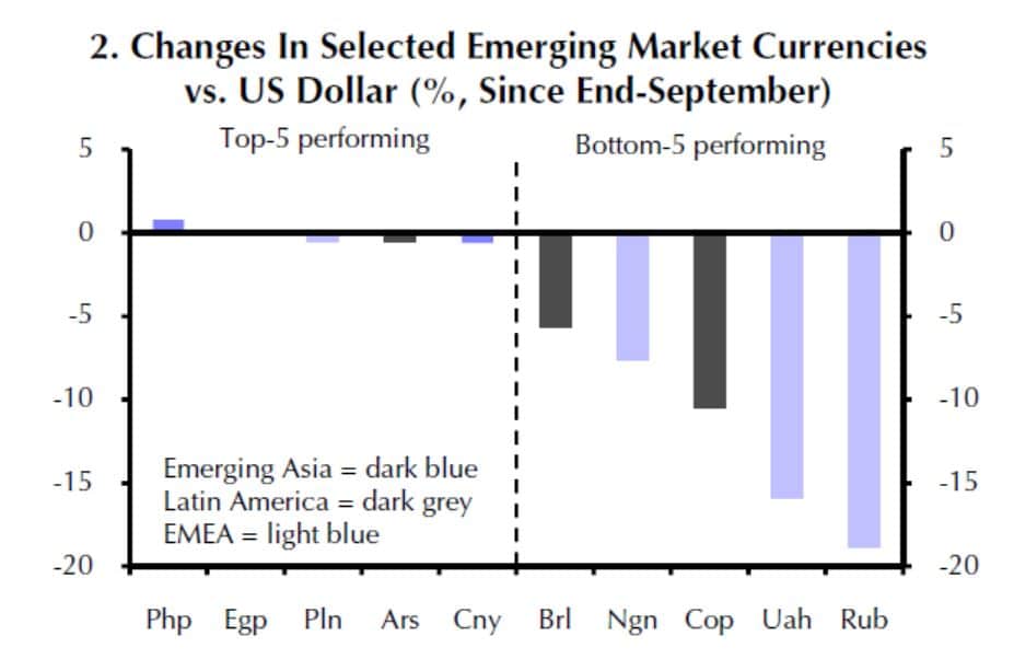 Für den in USD (oder Euro) denkenden Anleger können jedoch Abwertungen der EM-Fremdwährung zu heftigen Verlusten führen. Der Rubel (als Beispiel) verlor seit Ende September ca. zwanzig Prozent, der brasilianische Real über fünf Prozent.