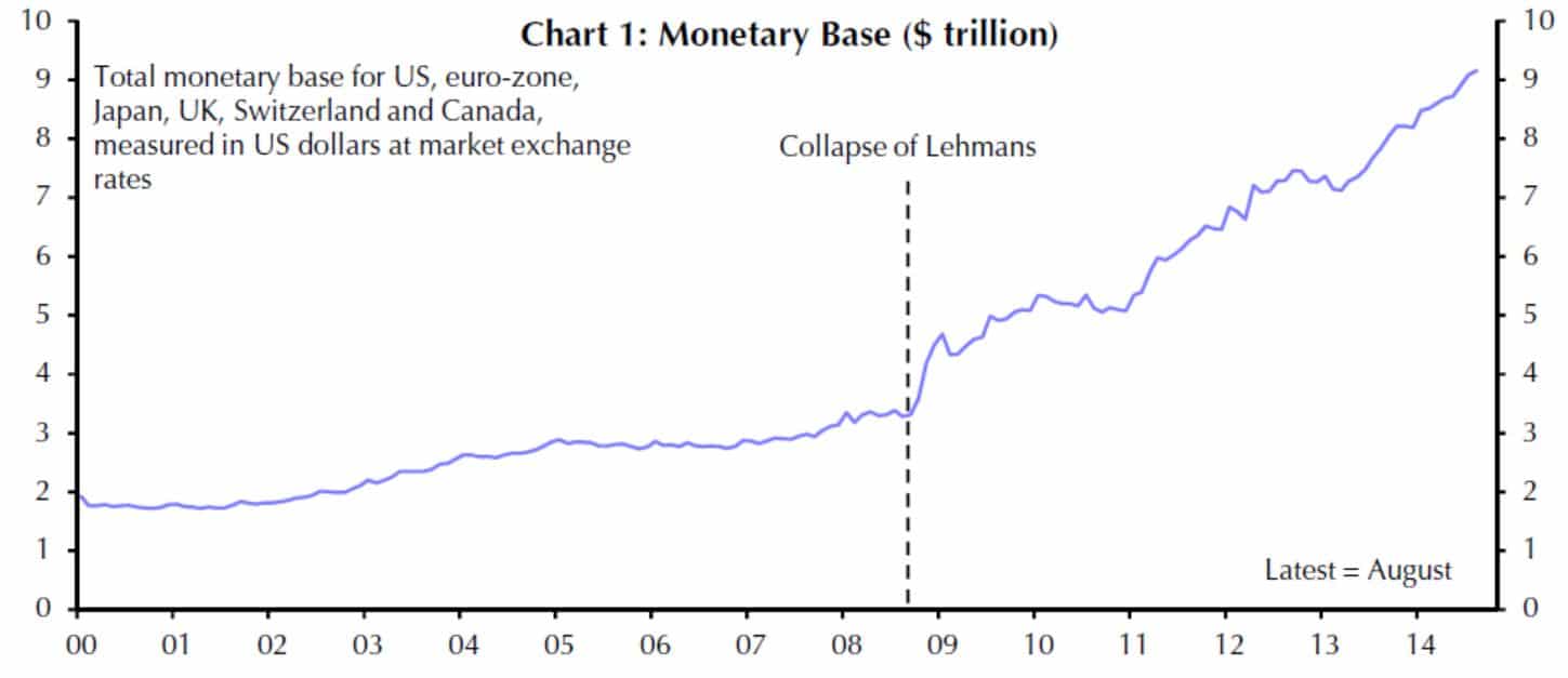 Seit dem Zusammenbruch der Lehman-Bank im Jahr 2008 wurde die Geldversorgung der Industrieländer von ursprünglich etwa drei Billionen USD auf über neun Billionen USD verdreifacht.
