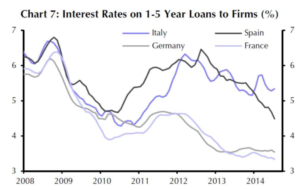 Die Zinsen von Unternehmenskrediten in Italien sind mit über fünf Prozent weiterhin hoch. In Spanien, das allgemein wegen seiner intensiven Bemühungen um Reformen gelobt wird, sanken dagegen die Zinssätze für Unternehmenskredite mittlerweile auf deutlich unter fünf Prozent. Deutsche und französische Unternehmen profitieren jedoch von Zinssätzen zwischen drei und vier Prozent. (siehe rechte Grafik)