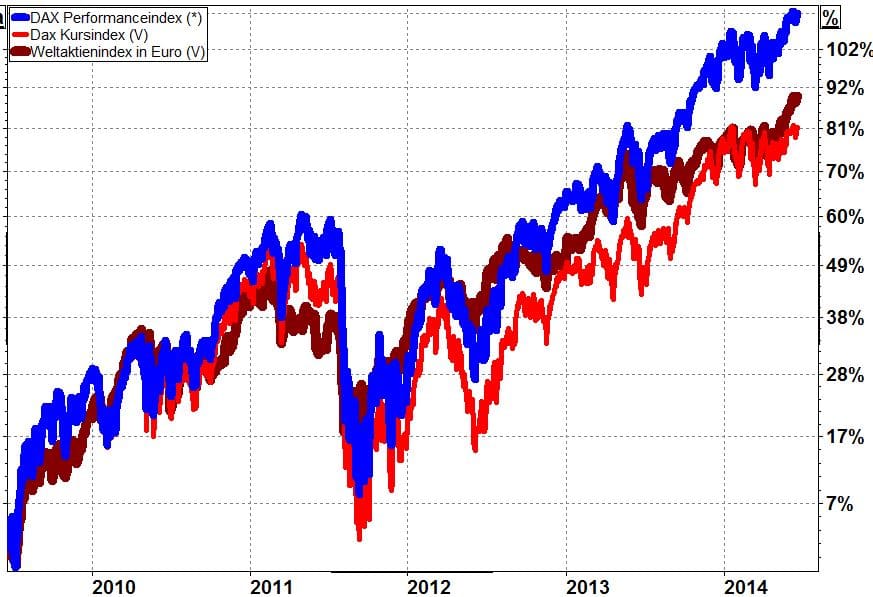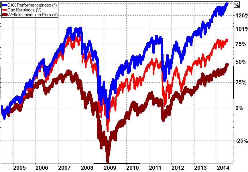 Auf den ersten Blick entsteht der Eindruck, dass der DAX (blaue Linie) den Weltaktienindex deutlich übertroffen hat. Ein zweiter Blick führt zu dem Dax Kursindex und damit zu einem realistischen Vergleich mit dem Weltindex. Hier erscheint der Unterschied der Wertentwicklung geringer. Der dritte Blick führt zu der Erkenntnis, dass der Vorsprung des Dax (richtig als Kursindex dargestellt) fast ausschließlich im Zeitraum von 2005 bis 2007 entstand.