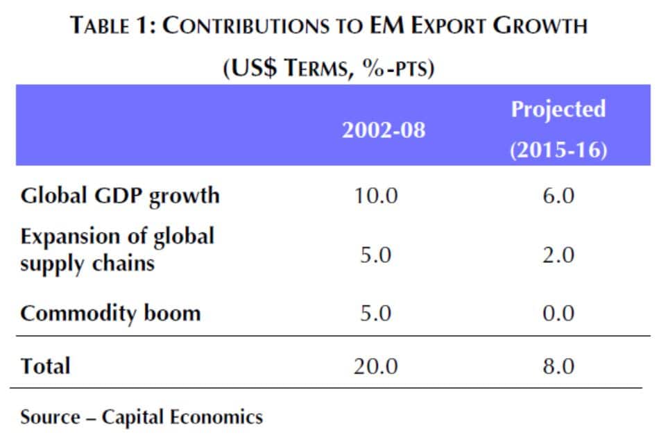 Von 2002 bis 2008 wuchsen die Exportleistungen der EM-Länder durchschnittlich um zwanzig Prozent jährlich. Dieses Wachstum resultierte mit einem Anteil von etwa zehn Prozent aus dem weltweiten GDP-Wachstum, zu fünf Prozent aus einem Ausbau der Produktionsketten und zu fünf Prozent aus dem Rohstoffboom. Für 2015 und 2016 prognostiziert CE bezüglich der EM-Exporte nur noch eine Wachstumsrate von acht Prozent.