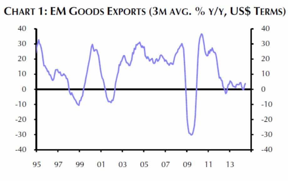 Die Exporte der EM (Emerging Markets) erhöhten sich in von 1995 bis 2011 mit einer durchschnittlichen Wachstumsrate von um die zwanzig Prozent. 1999, 2002 und 2009 gingen die Exporte zurück, jedoch jeweils gefolgt von einer starken Steigerung mit Wachstumsraten bis über dreissig Prozent. Seit 2012 verharren die Export-Wachstumsraten der EM jedoch auf einem deutlich geringeren Niveau.