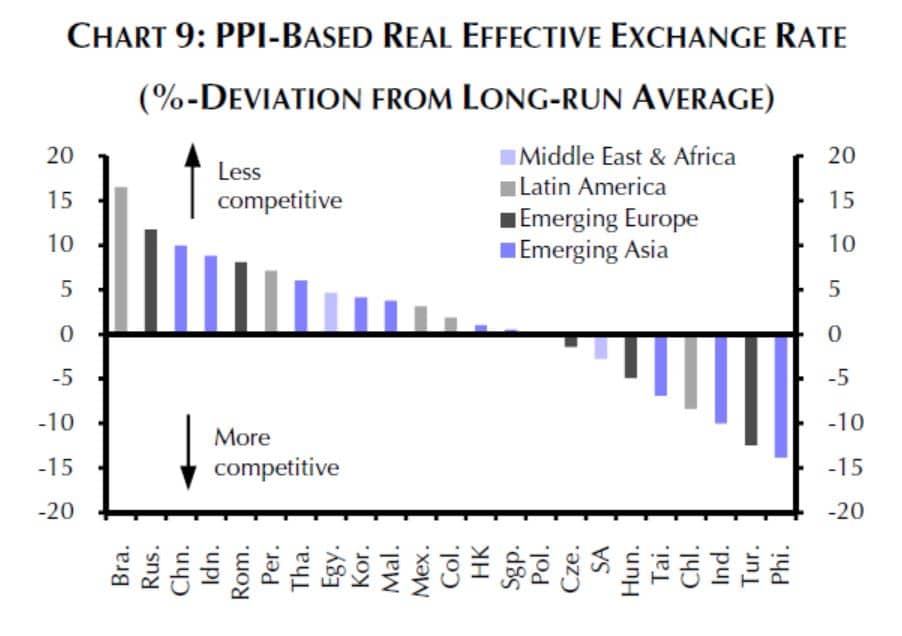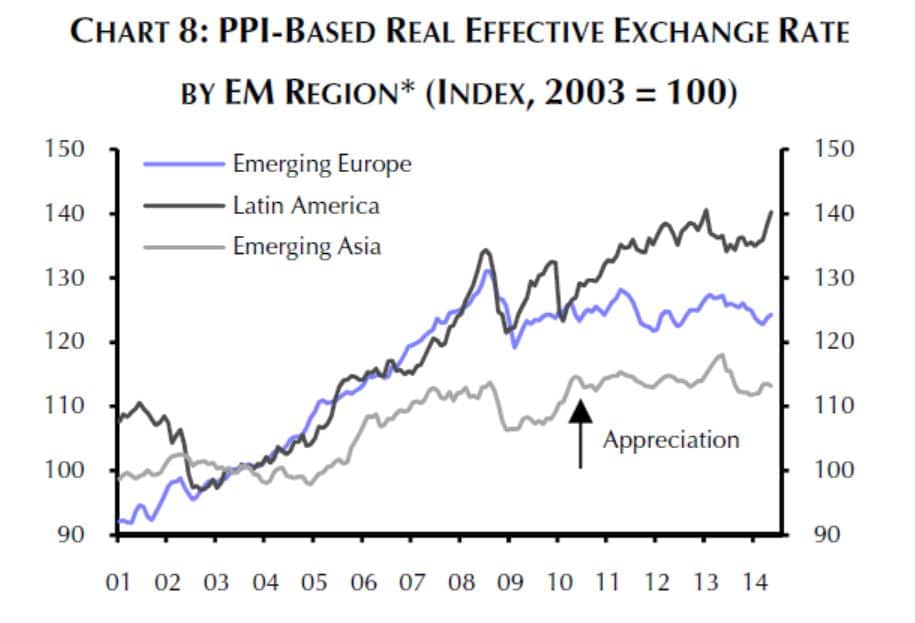 Ein weiterer Grund für künftig geringere Exportzuwächse ist der Rückgang an Wettbewerbsfähigkeit der EM, der vor allem auf die Erhöhung der Arbeitskosten (die einen willkommenen Anstieg der Arbeitnehmereinkommen mit sich bringen) zurückzuführen ist. Die REEF (reale effektive Kaufkraft) stieg in den Ländern Lateinamerikas (linke Grafik, dunkelgraue Linie) am stärksten, was die Wettbewerbsfähigkeit gegenüber anderen Ländern reduziert. In Emerging Europe (blaue Linie) und in Emerging Asia (hellgraue Linie) war der Anstieg der REEF geringer.