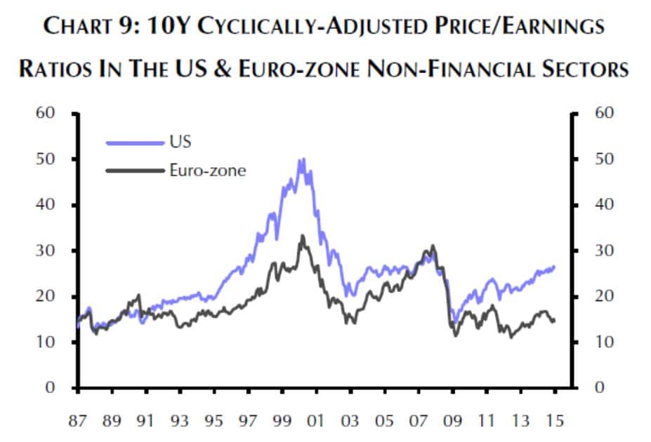 Beim Vergleich der Entwicklung des Kurs-Gewinn-Verhältnis der Aktien in den USA und in der Eurozone fällt sofort ins Auge, dass die Aktienmärkte der Eurozone derzeit deutlich günstiger bewertet sind als der Aktienmarkt der USA.
