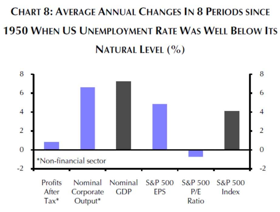 Gemäß den Erfahrungen aus den letzten acht Perioden, in denen der US-Arbeitsmarkt überdurchschnittlich stark war, führen eine überdurchschnittliche Nachfrage nach Arbeitskräften zu steigenden Arbeitskosten, was die Gewinnentwicklung der Unternehmen bremst. Die Grafik zeigt (von links nach rechts) die jährliche Veränderung der Kennzahlen aus den letzten acht Perioden überdurchschnittlicher Beschäftigung:
