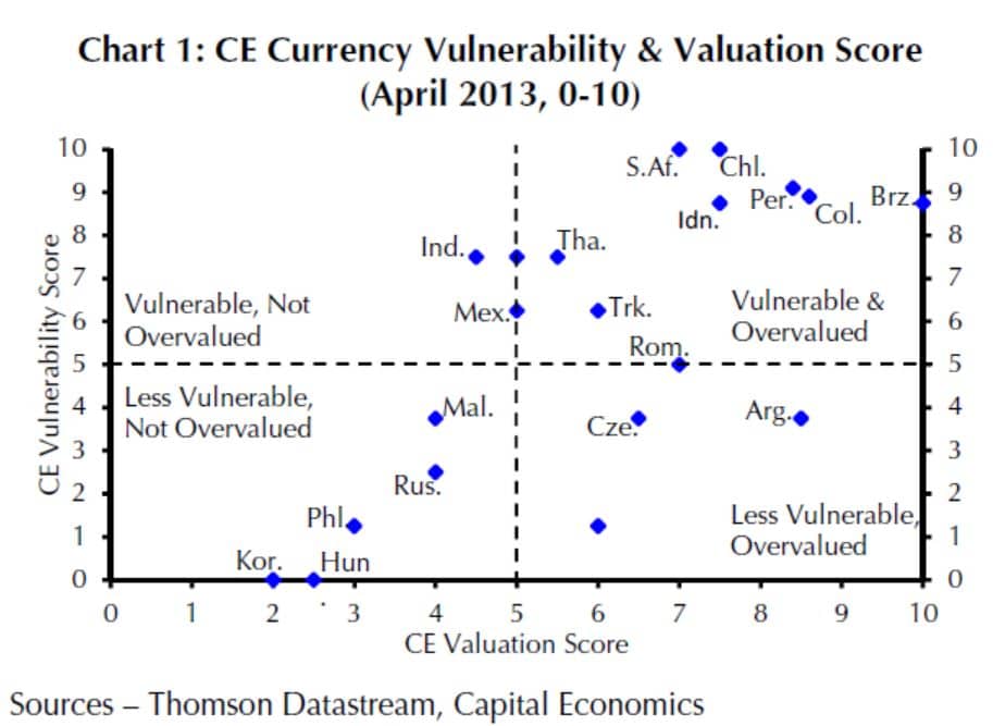 Capital Economics, der in London ansässige Researchdienst, kommt zum Ergebnis, dass die meisten Länder der Emerging Markets derzeit auf eine Zinserhöhung der FED gut vorbereitet sind. Die Situation hat sich seit April 2013 (siehe Grafik links) bis heute (Grafik rechts) noch weiter verbessert. Einen großflächigen Ausverkauf der Währungen erwartet CE nicht. Allerdings könnte der brasilianische Real, die indonesische Rupie, der südafrikanische Rand und der peruanische Neuvo Sol noch weiter abwerten.