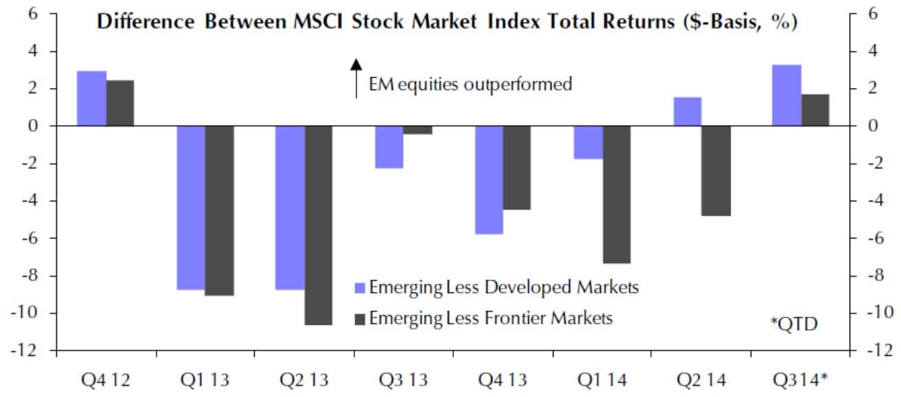 Der jüngste Bericht über die Wertentwicklung der Börsen in den Emerging Markets unterstreicht den positiven Ausblick (siehe 10.09.: EM-Börsen mit positivem Ausblick). Die Outperformance der EM gegenüber den DM (Developed Markets) und auch den Frontier Markets, die im zweiten Quartal 2014 bereits begonnen hat, setzt sich im dritten Quartal 2014 mit noch größerer Deutlichkeit fort. I(siehe blaue Säulen)