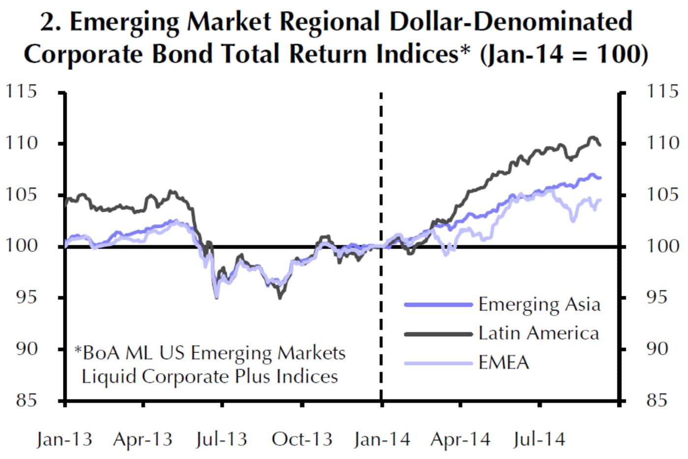 Die Gesamterträge der USD-Anleihen von Unternehmen in den EM entwickeln sich in Asien am stabilsten.