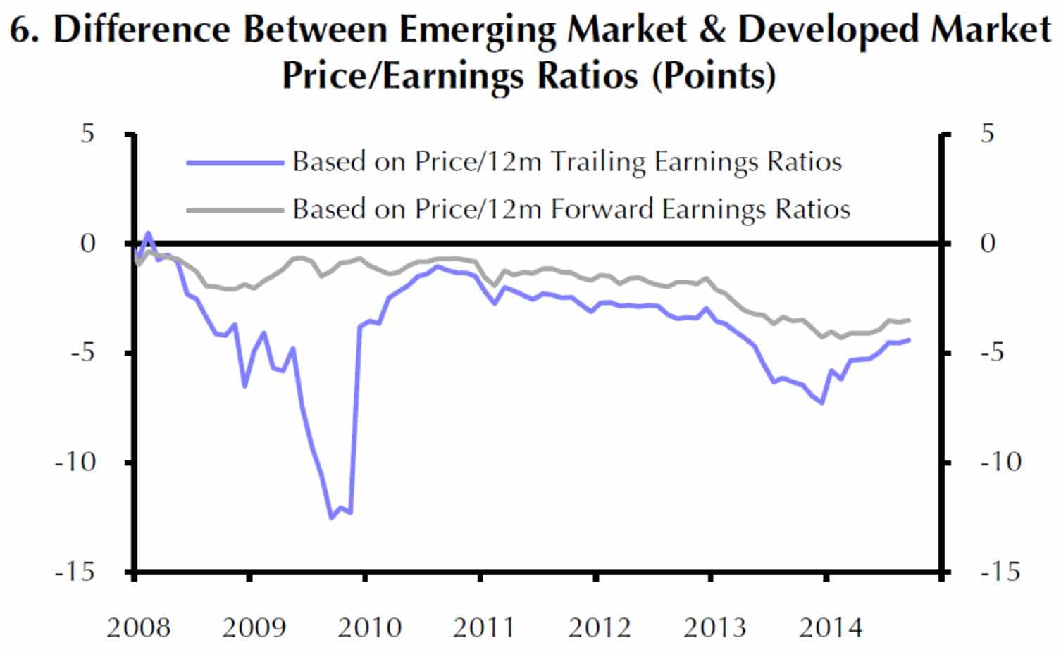 Die blaue Linie zeigt die Bewertung der EM-Aktienmärkte gegenüber den DM-Märkten auf Basis der KGV – Vorschau für die nächsten 12 Monate